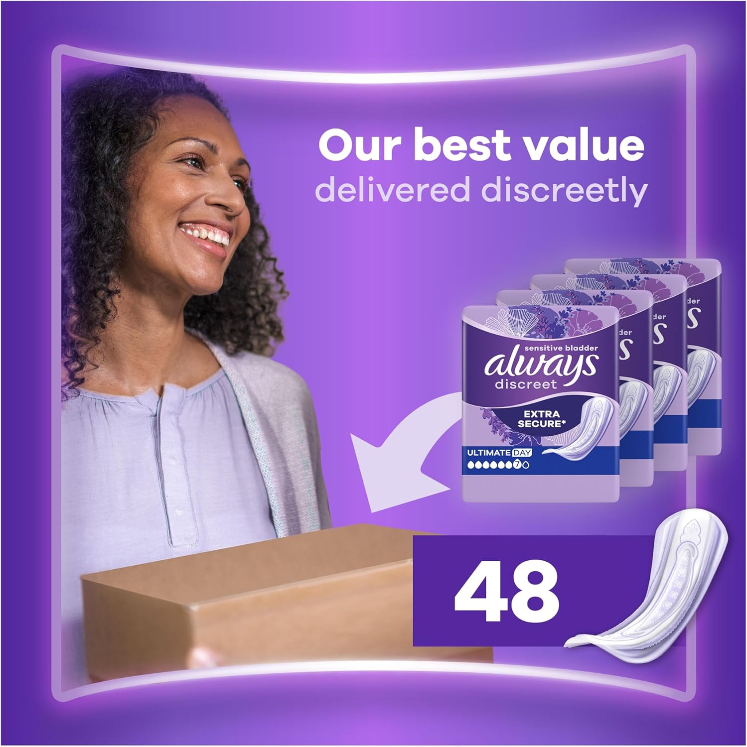 Our highest absorbency pad in the range, ideal for worry-free days. Always Discreet Incontinence Pads Ultimate Day make you feel extra secure, give you extra coverage and absorbency so you can stop worrying about leaks. Each pad is designed to offer you trusted protection from leaks, odour control, instant-dryness, a soft & gentle feel on skin, and a discreet fit. Their structure enables strong protection with an ultra-thin core so you won’t have to compromise between comfort and protection. If sneezing or laughing causes bladder leaks, you can feel confident with the discreet and reliable protection offered by Always Discreet Pads. Also useful as maternity pads for postpartum incontinence.