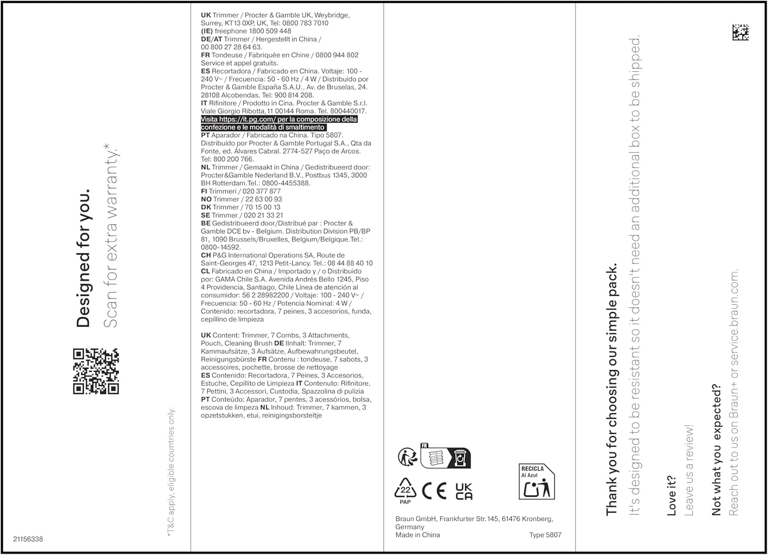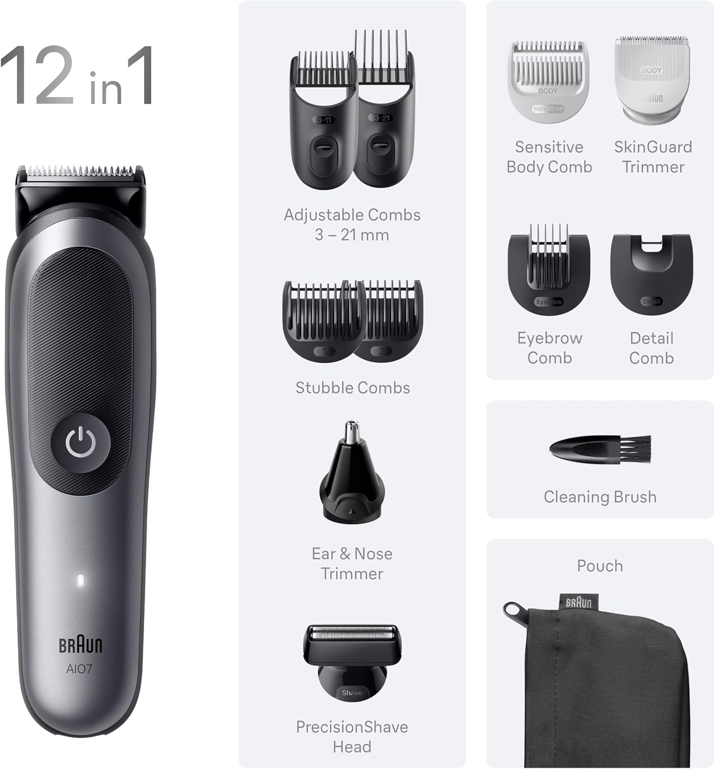 Braun’s best All-in-One Grooming Kit for men. The 12in1 Tool Kit lets you effortlessly trim your beard, ears, nose, clip your hair and groom your whole body. Achieve precision with the Ultra Sharp ProBlade on any beard with AutoSense Technology. Get a precise shave and perfect lines with the PrecisionShave head. 14 length settings and AquaGrip for underwater use give full control. AIO Series 7 is built to last, waterproof, and with up to 120-min runtime Li-Ion battery. Packaging may vary. Box content: 1 trimmer, 7 combs, 3 attachments, 1 cleaning brush, 1 pouch