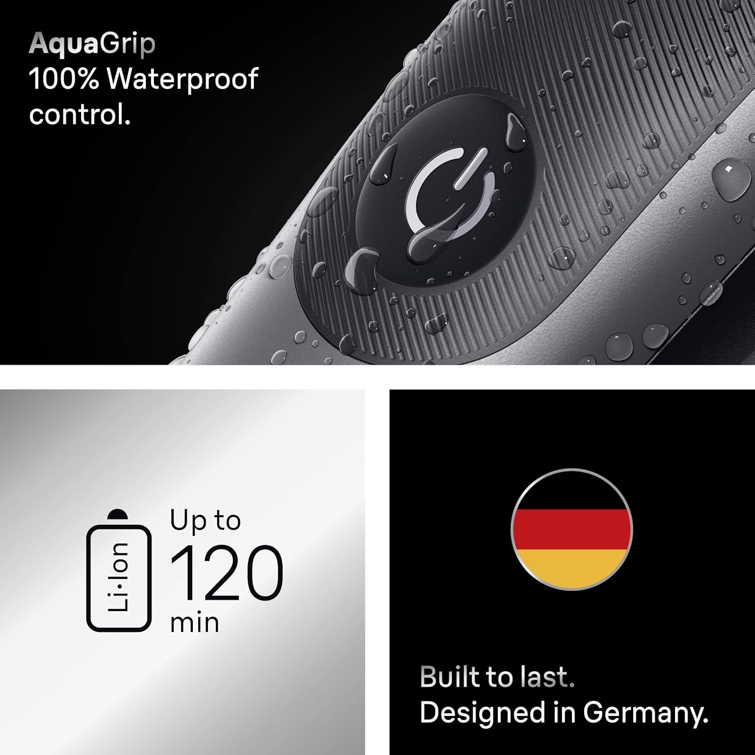Waterproof and Long-Lasting Battery- Fully waterproof for shower use with AquaGrip for extra control plus powerful Li-Ion battery delivers up to 120 minutes of cordless trimming