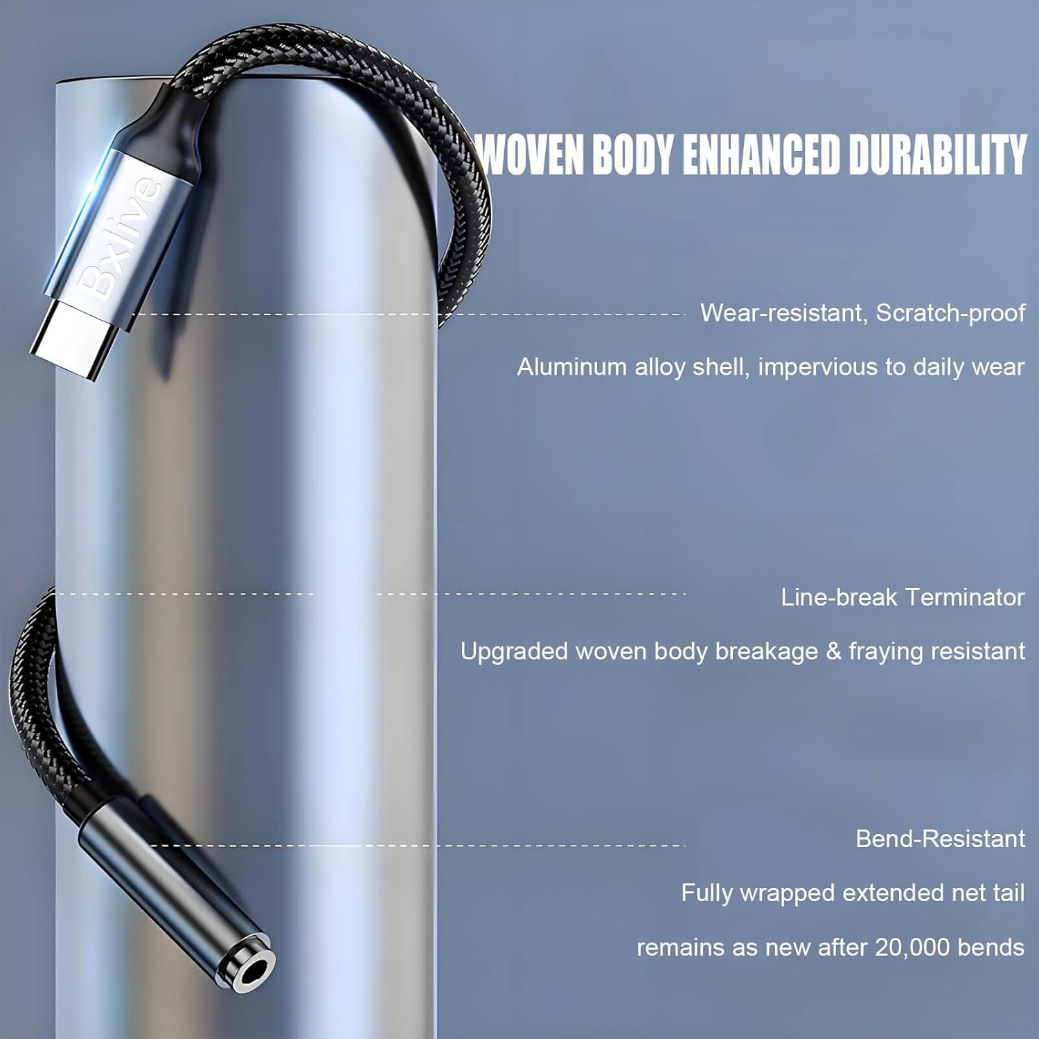 Enhanced Durability & Upgraded Materials: The Bxlive Aux to USB C Cable is meticulously engineered for exceptional longevity. USB C to 3.5mm jack adapter with robust nylon-braided jacket not only prevents tangling but also minimizes wear and tear, boasting an impressive lifespan of over 20,000 bends. Complementing this durability, the aluminum housing is resistant to oxidation and corrosion, significantly enhancing the sound quality of this USB Type C to 3.5mm earphone adapter. Additionally, the thickened copper core effectively safeguards the audio signal against interference during transmission, ensuring a pristine listening experience while enhancing the overall durability of the adapter.