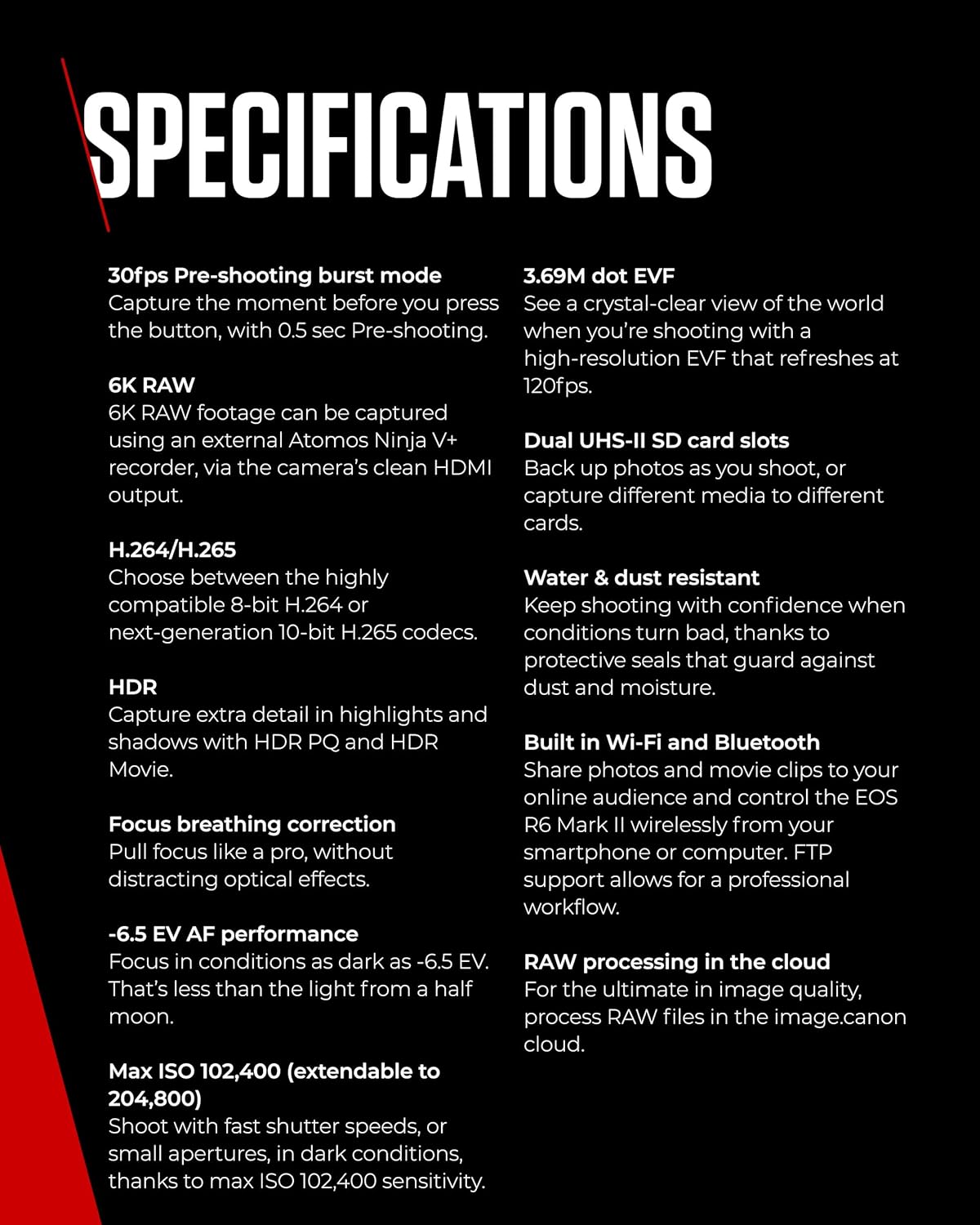 Master your photography and filmmaking with the EOS R6 Mark II, an innovative hybrid camera that delivers uncompromising quality in any situation thanks to its full frame 24.2-megapixel CMOS sensor and DIGIC X processor. Tell stories in low light with ISO that goes up to 102,400 (ext. to 204,800) and the ability to focus in as little light as -6.5EV. With up to 40fps1 of continuous shooting and 0.5 sec pre-shooting, capture microscopic moments. Focus and track subjects with greater speed and precision with deep learning AI and Dual Pixel CMOS AF II technology2. Get smooth footage with 5-axis In-Body IS that when paired with Optical IS reduces camera shake up to 8 stops3. Get cinematic results with oversampled 4K 60p, 6K RAW4, Full HD Slow-motion video at 180 fps and gain creative control with Exposure Modes, Aspect markers, and recording for up to 6 hours5. With the 3.69M dot EVF that refreshes at 120fps and conveniently placed AF multi-controller, there’s no need to take your eye off the crystal clear view. Create content your way with dual card slots, 3.5mm mic & headphone inputs & a micro-HDMI for external recording. Easily connect to a smart device for file sharing and remote camera control with Wi-Fi & always-on Bluetooth® 5.0 shortening your workflow. What’s in the Box EOS R6 Mark II Body; Camera Cover R-F-5; Strap EOS R6 MARK II; Shoe cover ER-SC2; Battery Charger LC-E6E; LP-E6NH Battery; Battery Pack Cover; AC Cable; User Manual Kit 1. Cont. shooting speed may vary. 2. Apl. when subject frame shown while tracking & compatible lens attached. Ref. to “cam.start.canon” for further details. 3. Yaw/Pitch direction, based on CIPA standard. 4. Externally via HDMI output 5. If cameras internal temp. becomes too high, max recording time will be reduced.