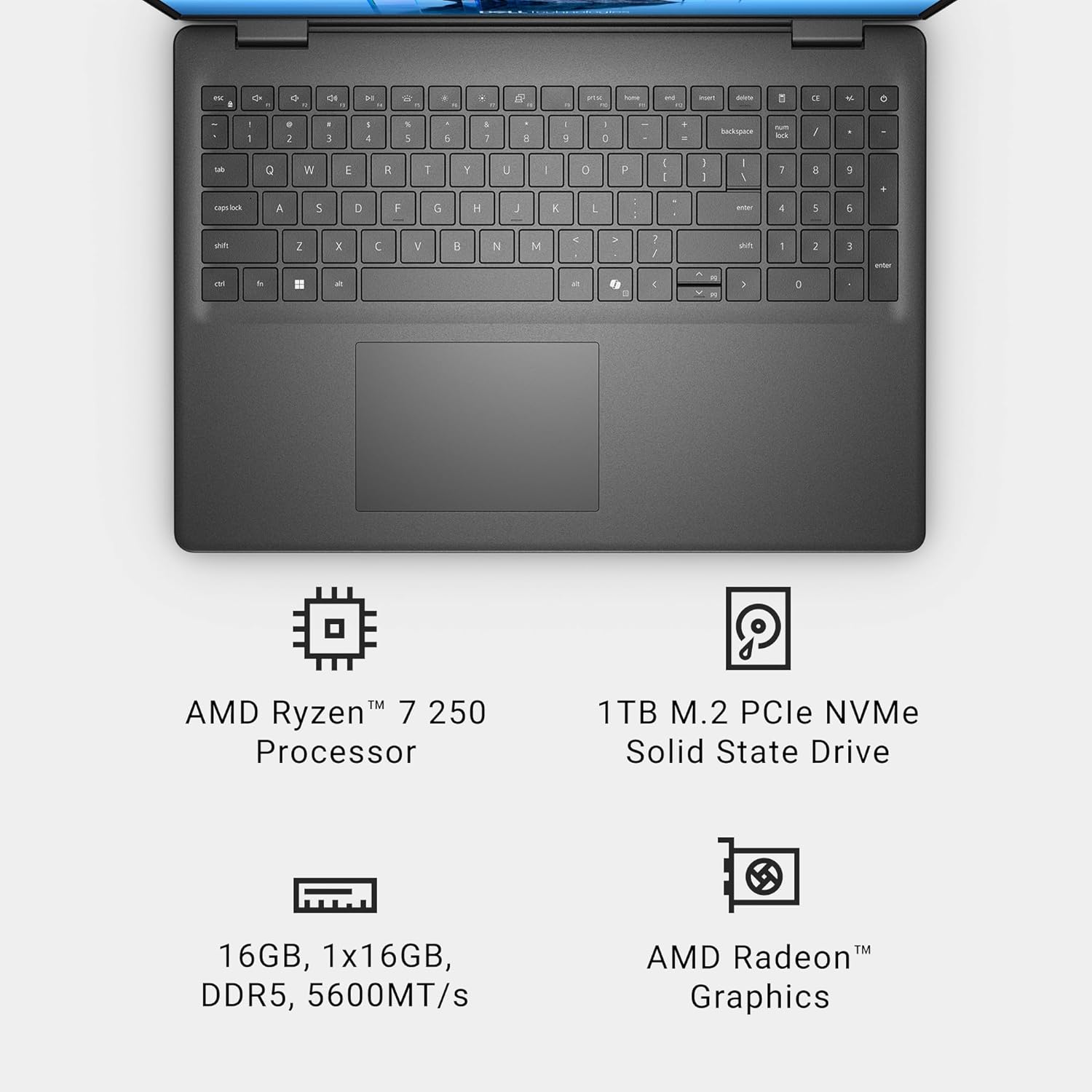 Dell 16 Laptop DC16255 16-Inch 2K (1920×1200), AMD Ryzen 7 250, AMD Radeon Graphics, 16GB DDR5 RAM, 1TB SSD, Windows 11 Home, Fingerprint Reader, UK Qwerty Backlit Keyboard, Carbon Black