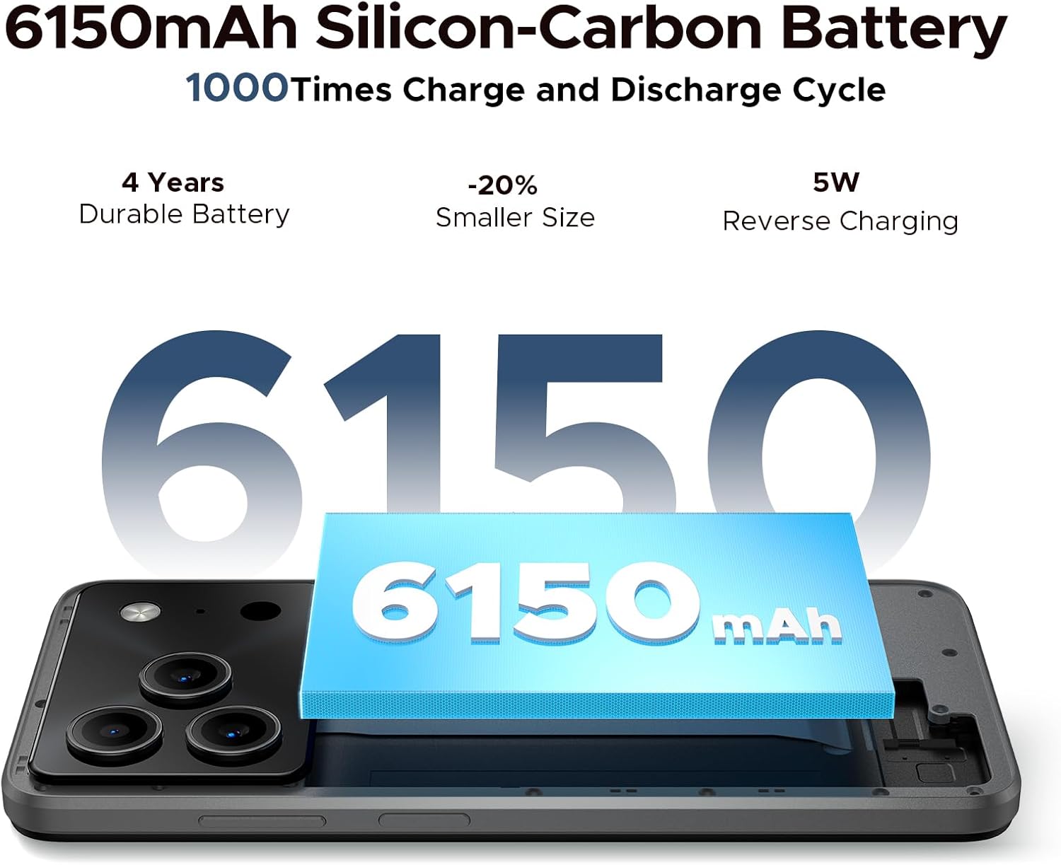 【6150mAh Silicon-Carbon Large Battery & OTG】DOOGEE Mobile Phones Note 56 Pro has a 6150mAh battery with silicon-carbon material, packing high energy in a small size, minimizing energy loss with great conductivity, giving up to 14 hours of video playback.Silicon prevents swelling, enhancing battery life, stability, and safety. You can get a hassle-free, long-lasting mobile use. It also supports OTG reverse charging function, which turns your phone into a portable charger to quickly charge your headphones, bracelet or other devices with both practicality and convenience.
