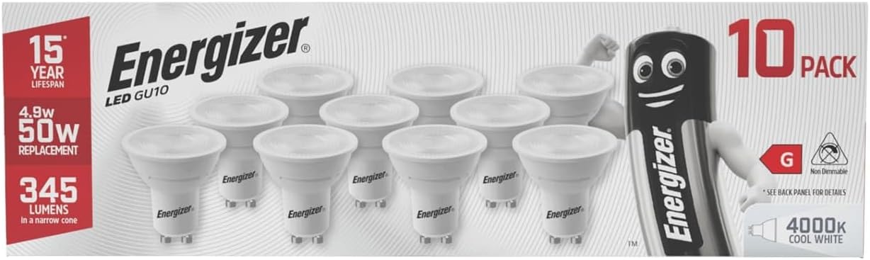 Specification: Energizer GU10 LED Bulbs Cool White. 50w Equivalent Spotlight Bulbs. 4000k – 345 Lumen. Non Dimmable – Pack of 10