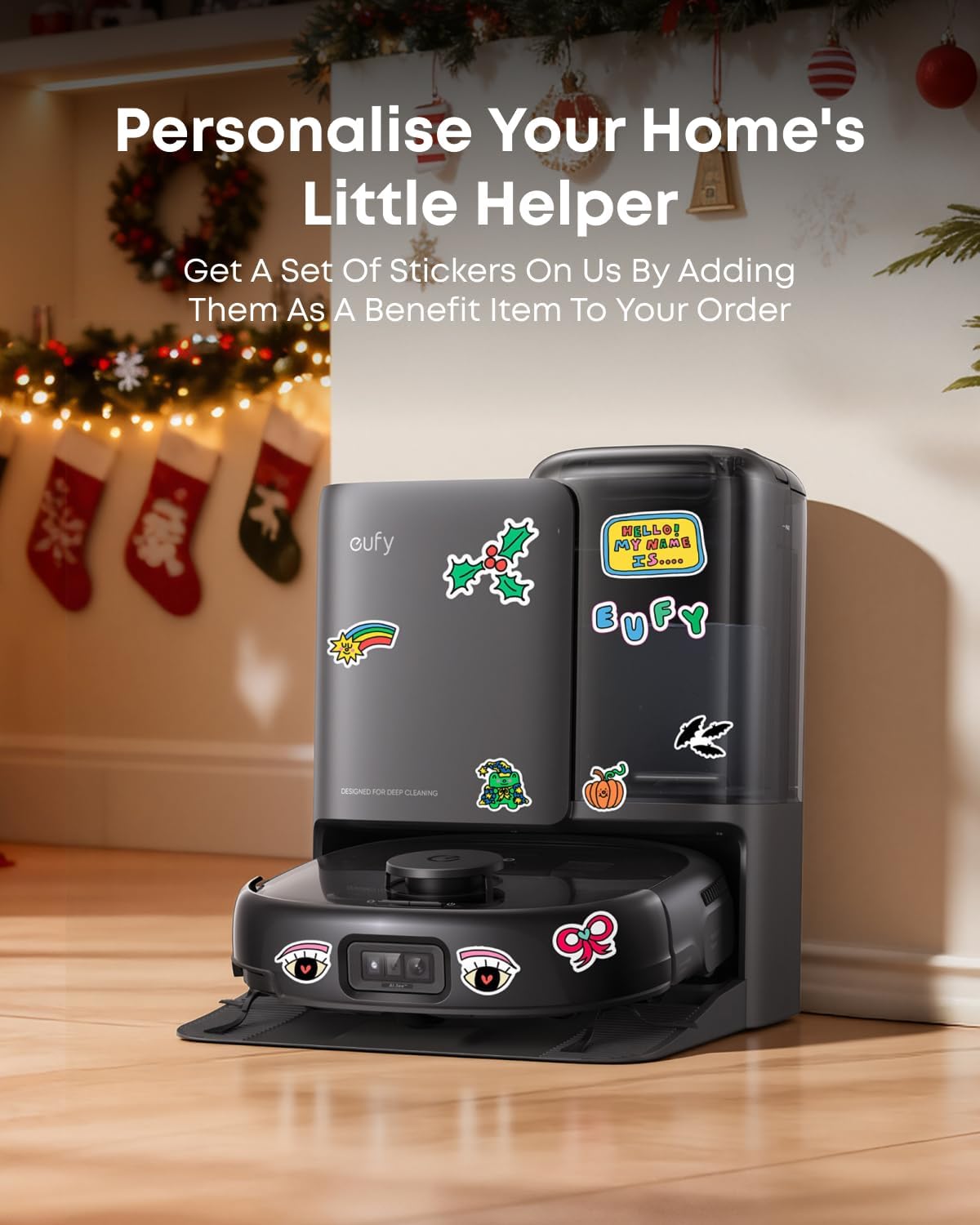 𝐏𝐞𝐫𝐬𝐨𝐧𝐚𝐥𝐢𝐬𝐞 𝐘𝐨𝐮𝐫 𝐞𝐮𝐟𝐲 𝐑𝐨𝐛𝐨𝐭 𝐕𝐚𝐜𝐮𝐮𝐦: Get creative this Christmas with stickers to decorate your little helper and bring your Robot Vacuum to life. Get a set of stickers on us by adding them as a benefit item to your basket and order.
