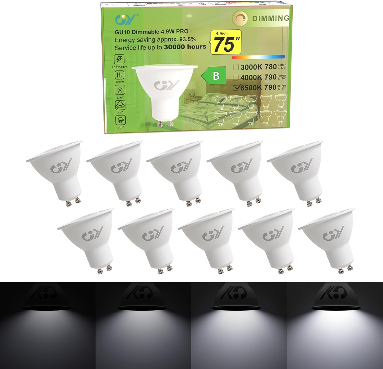 Specification: GY Dimmable GU10 Cool White 790 Lumen High Energy Efficiency LED Bulbs,4.9W 6500K 120° Wide Beam Angle Energy Saving Lamp, 75W Replacement,10 Pack