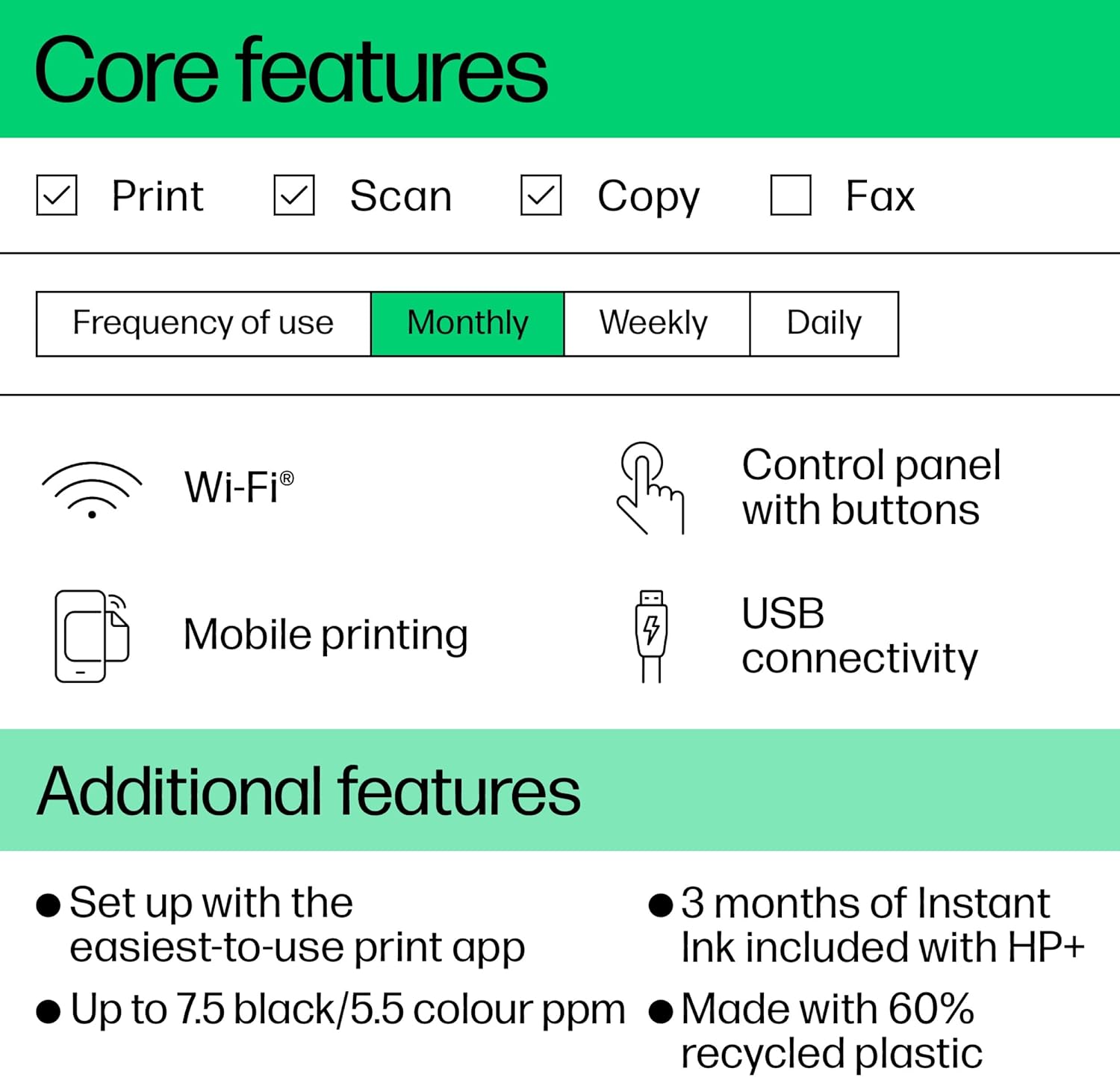 Specification: HP DeskJet 2810e All in One Printer | Perfect for Home | Colour | Wireless | Print, Scan & Copy | 3 Months of free Instant Ink | Easy Setup & Reliable Wi-Fi | White