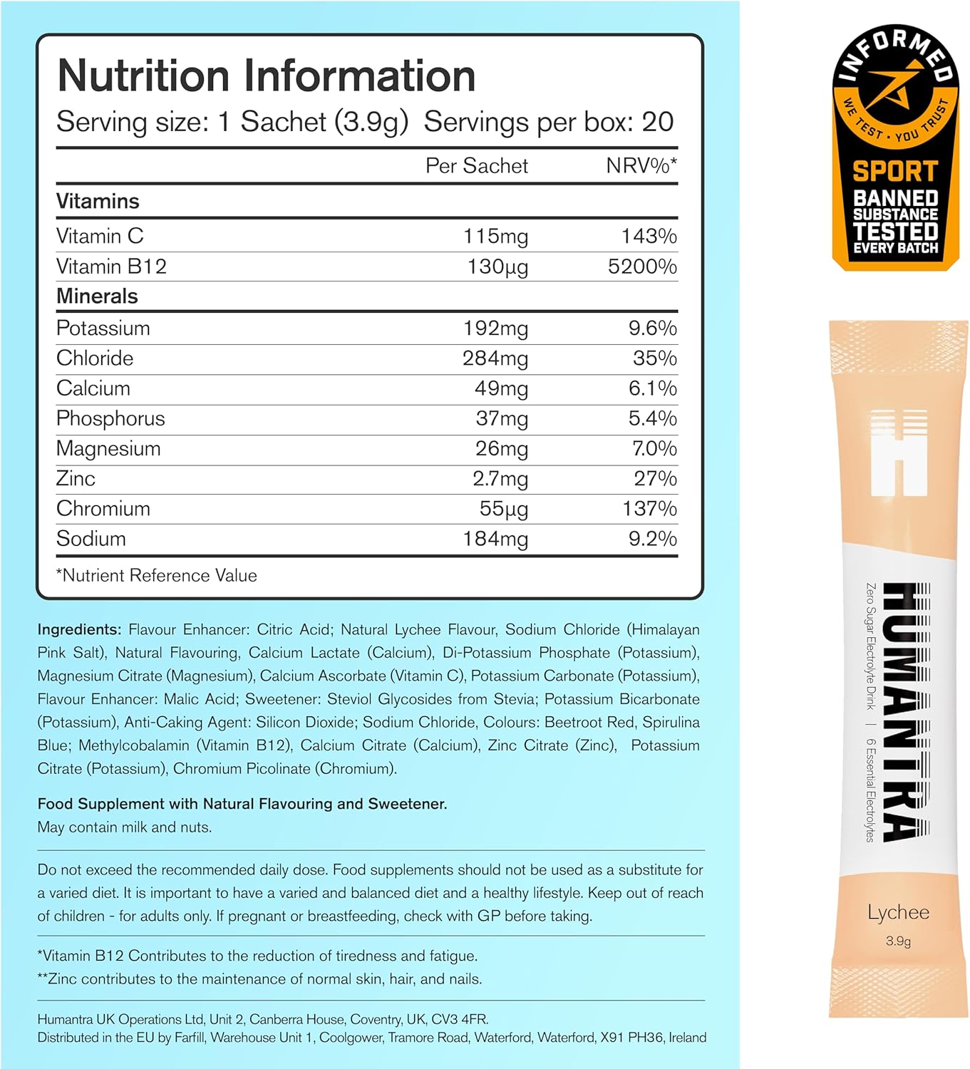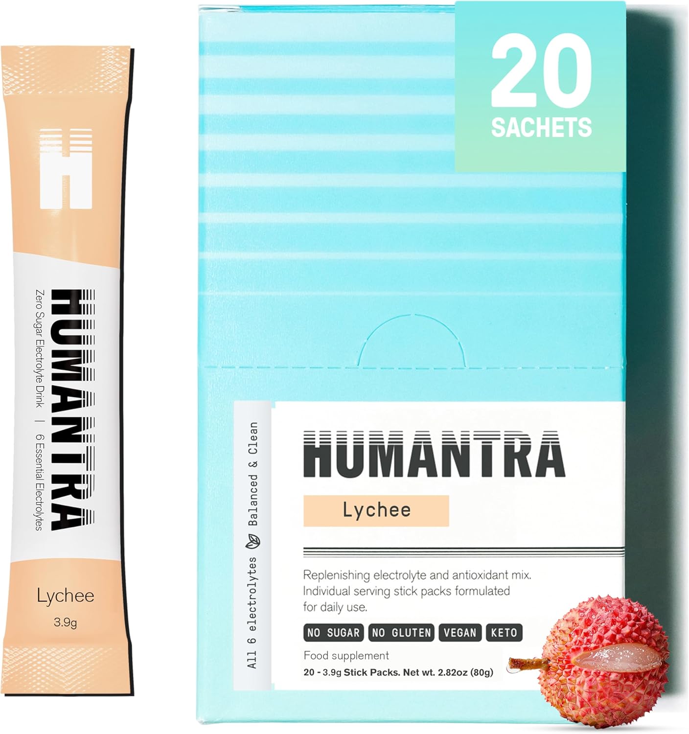 Specification: Humantra Electrolyte Packets | Zero Sugar | W/ 6 Electrolytes | Electrolytes Powder (20 Count, Lychee)