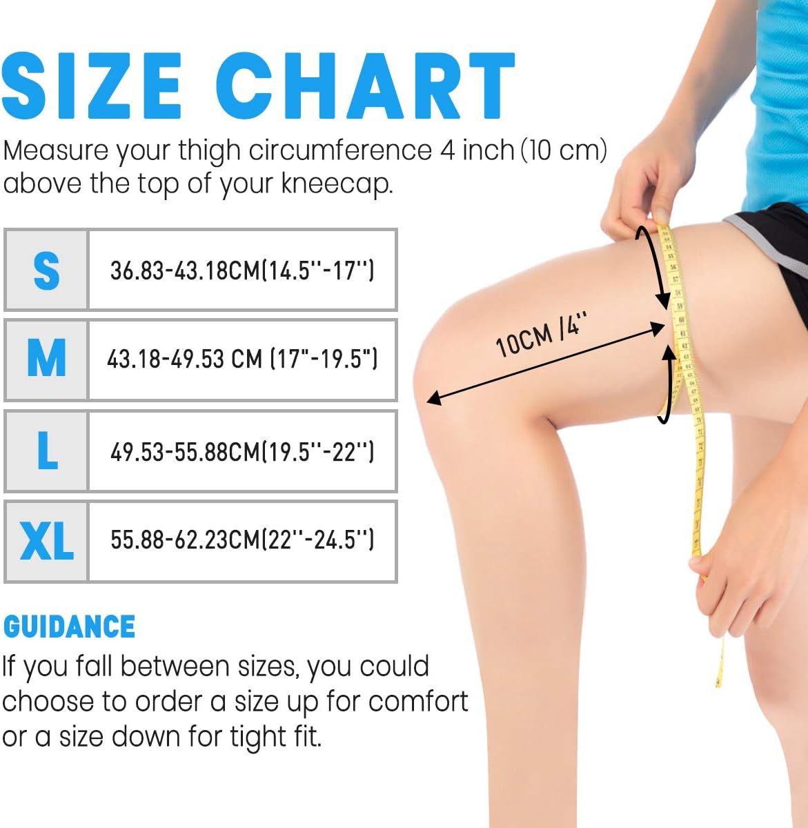 Measure your thigh circumference 4 inch(10 cm) above the top of your kneecap and select the correct size from the size chart image.If you fall between sizes, you could choose to order a size up for comfort or a size down for tight fit.NOTE: Kindly remind that our sizes are based on the average knee sizes. But do not be worried, each compression knee sleeves can be extended up to 60% of the specified original sizes.