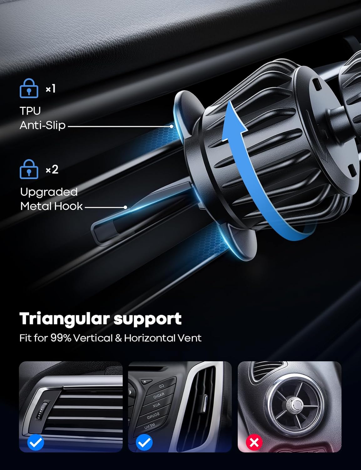 【Strong Metal Hook】 This air vent car phone holder is designed with an ultra-stable hook to form a “triple lock protection”, which is tightly hooked on the blade and won’t fall off. Even under hard braking, bumpy roads or sharp turns, the car phone mount stays firmly at the original position.