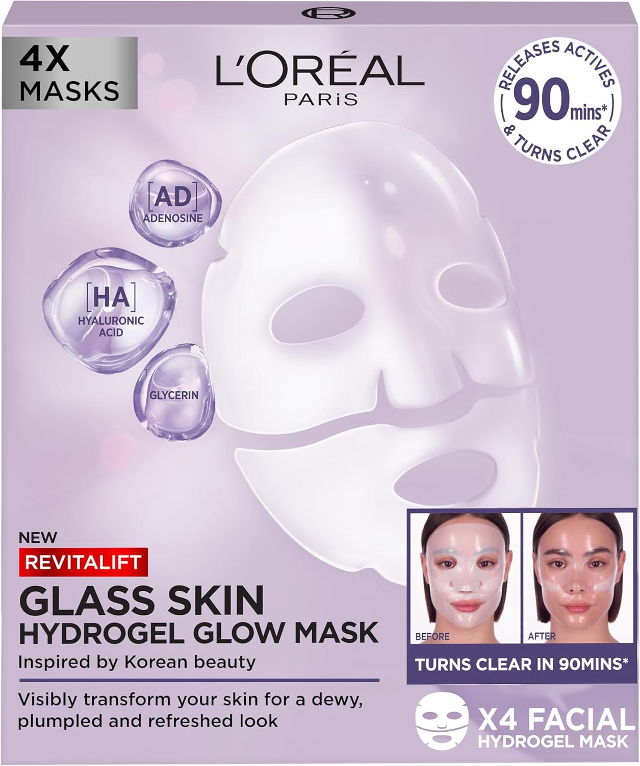 Discover the L’Oréal Paris Glass Skin Hydrogel Glow Mask in a 4 pack, our fast-acting transformative hydro-gel mask inspired by Korean Beauty. This innovative mask is designed to deliver an instantly glowing, dewy, and refreshed look, bringing visible glass skin results in just 90 minutes*. The hydrogel mask is infused with derm actives which target the skin as it visibly turns clear on your skin. The unique formula is enriched with a blend of derm actives, chosen to intensely hydrate and visibly smooth the skins surface. The Hydrogel mask contains Hyaluronic Acid, known for its ability to visibly plump the skin and provide intense hydration; Glycerin, known to act as a powerful moisture magnet, locking in hydration for lasting comfort; and Adenosine, known to further contribute to smoother looking skin. Transform your skin and experience glass skin in 90 minutes*, with a visibly dewy, glowing, and refreshed complexion after just one use. Clinically tested on all skin types, the L’Oréal Paris Glass Skin Hydrogel Glow Mask brings real glass skin to everyone. Use as part of our Glass Skin Routine: 1. Glass Skin Hydrogel Glow Mask / 2. Glass Skin Liquid Cream / 3. Revitalift Aquafluid Moisturizer with SPF30. *CONSUMER TEST, 124 WOMEN. INDIVIDUAL RESULTS MAY VARY.