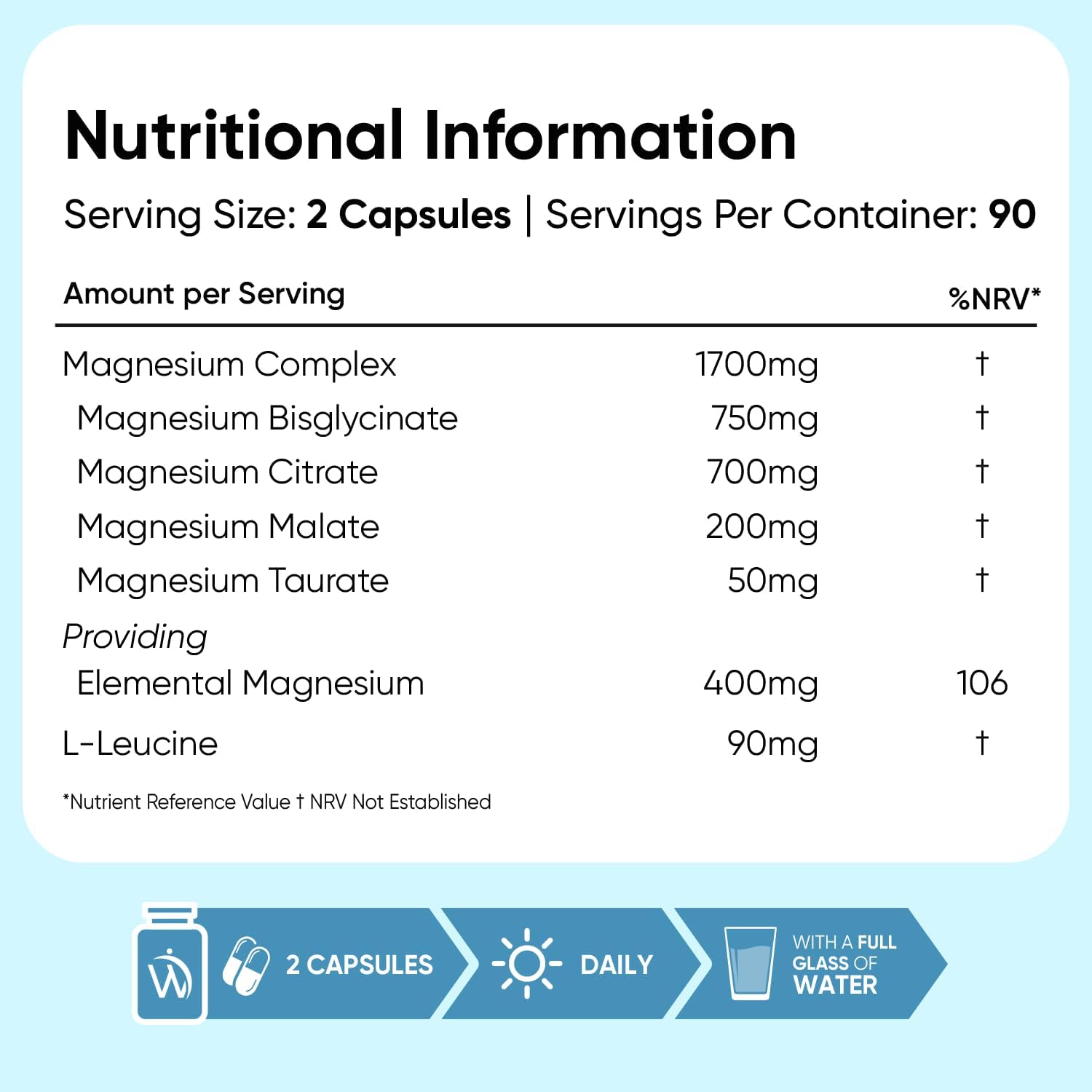180 CAPSULES – 3 MONTHS SUPPLY: Each bottle contains 180 capsules, providing a convenient 3-month supply when taken at 2 capsules per day. Each serving delivers 1700 mg of magnesium compounds from magnesium glycinate, citrate, malate, and taurate, offering 400 mg of elemental magnesium (106% NRV). Each serving also offers 90 mg of leucine for nutrient utilisation.