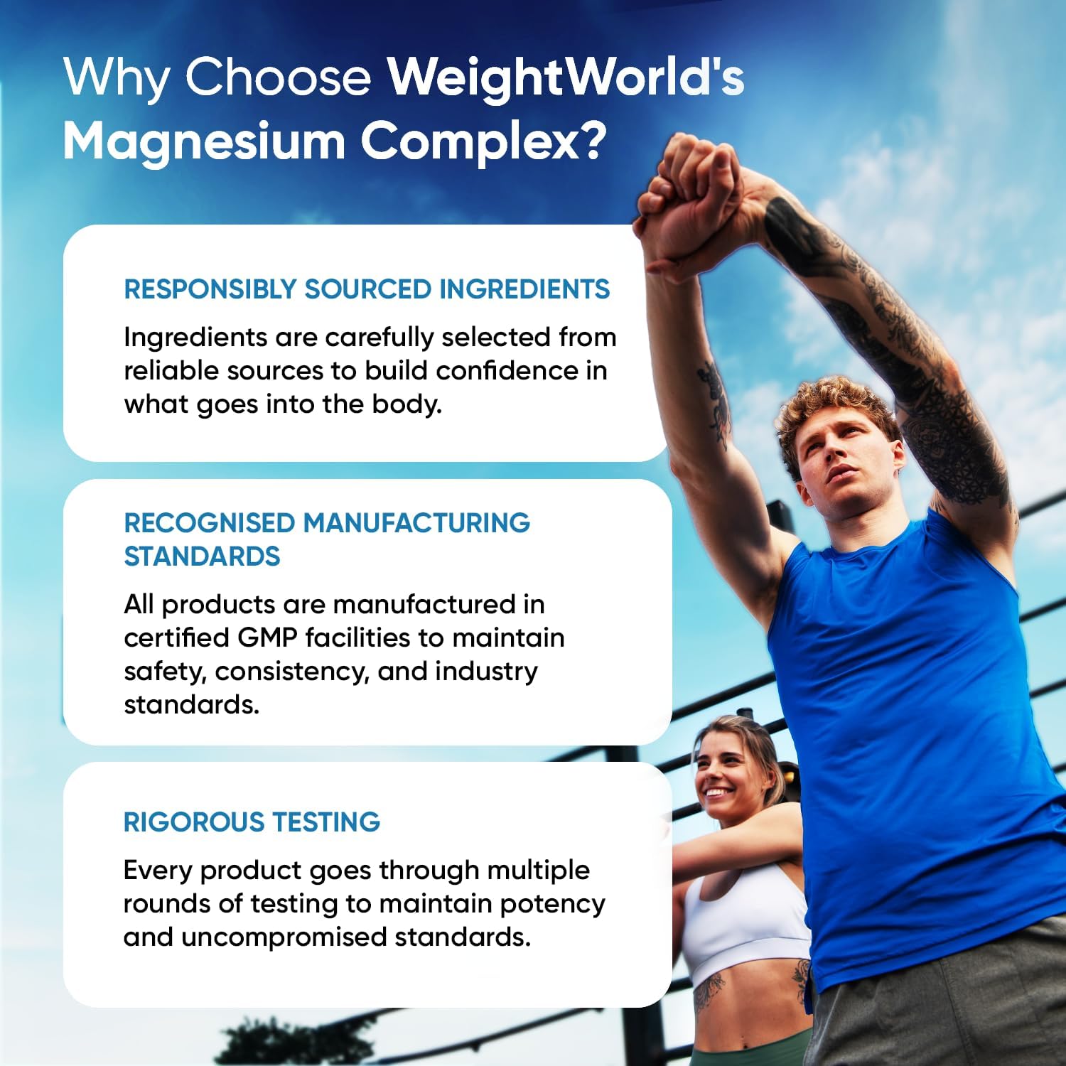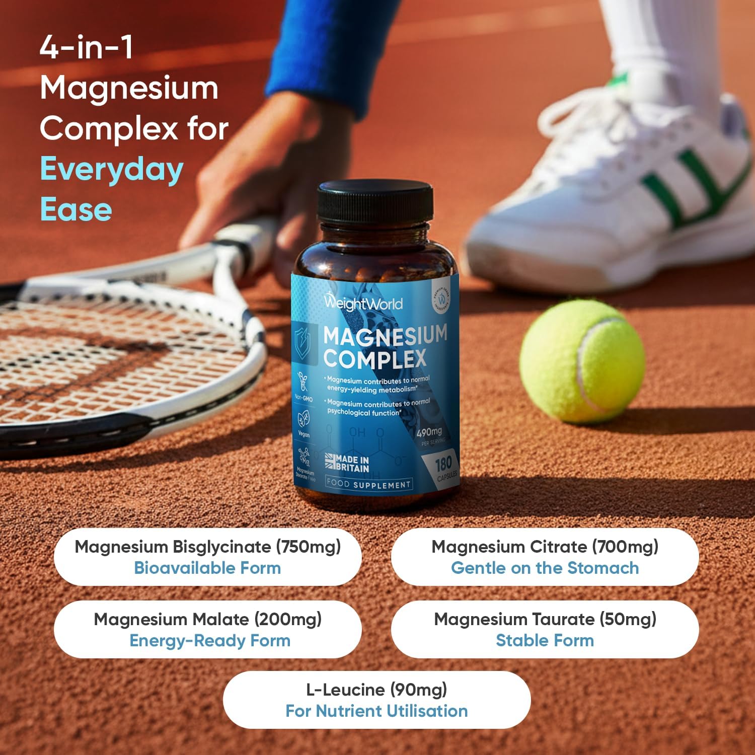 MAGNESIUM – A MIGHTY MINERAL: During regular training and physically demanding activities, minerals like magnesium can be lost through sweat. Maintaining adequate magnesium levels is particularly important for those who engage in regular physical activity. Magnesium is also widely considered to be part of an evening routine, as it allows the body to unwind and transition into the nighttime. WeightWorld’s unique Magnesium Complex combines four forms of this key mineral in one convenient formula.
