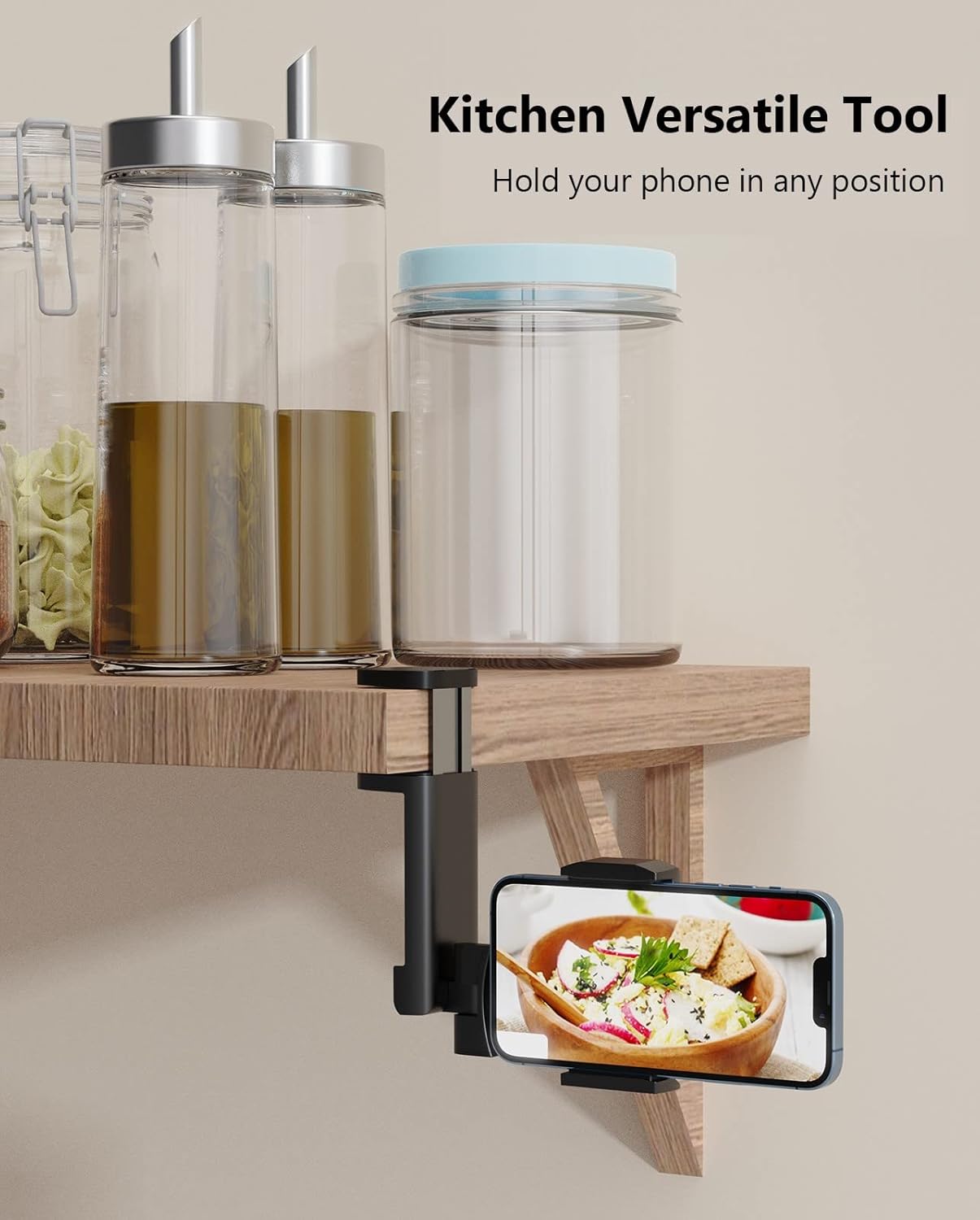 Multi-purpose phone mount shown in four settings: airplane headrest, desk, kitchen counter, and bedroom scenarios. Features adjustable grip mechanism.Multi-purpose phone mount shown in four settings: airplane headrest, desk, kitchen counter, and bedroom scenarios. Features adjustable grip mechanism.