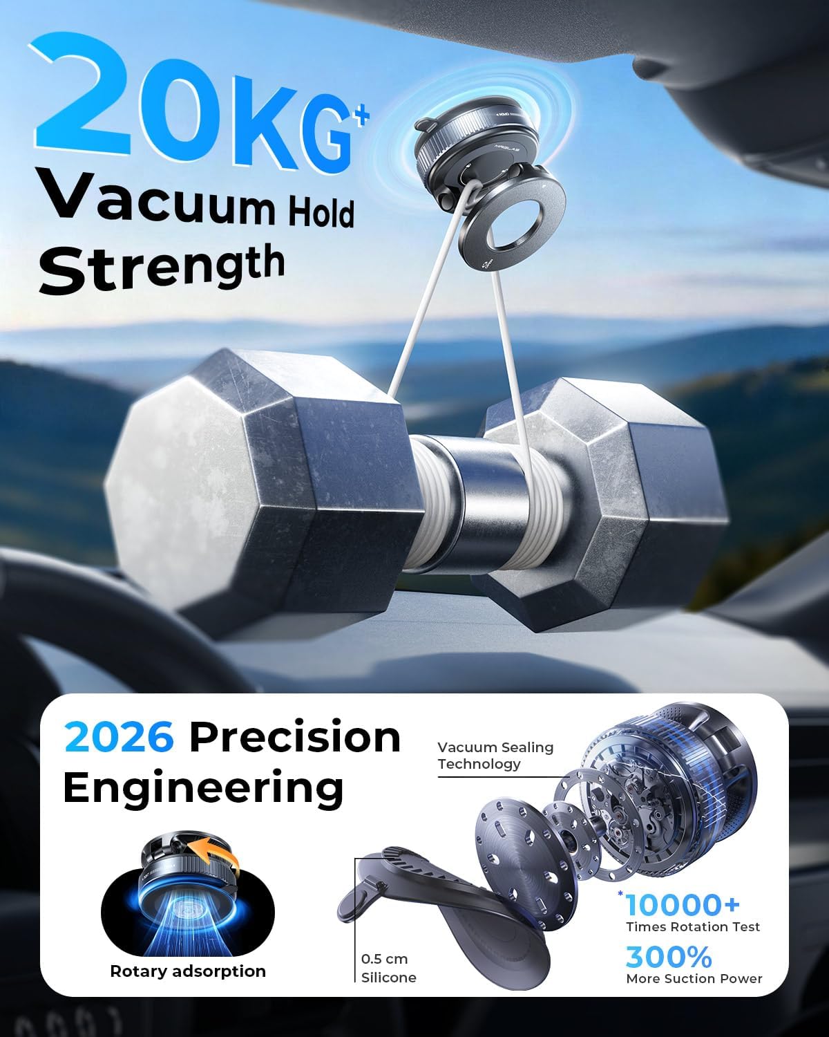 [Strong Hold & Stability on Any Road]: Equipped with advanced rotary vacuum suction technology, this phone holder offers 65% stronger suction power than conventional models. It stays stable even on bumpy roads, sudden stops or sharp turns and ensures that your phone stays securely in place no matter how difficult the driving conditions are.