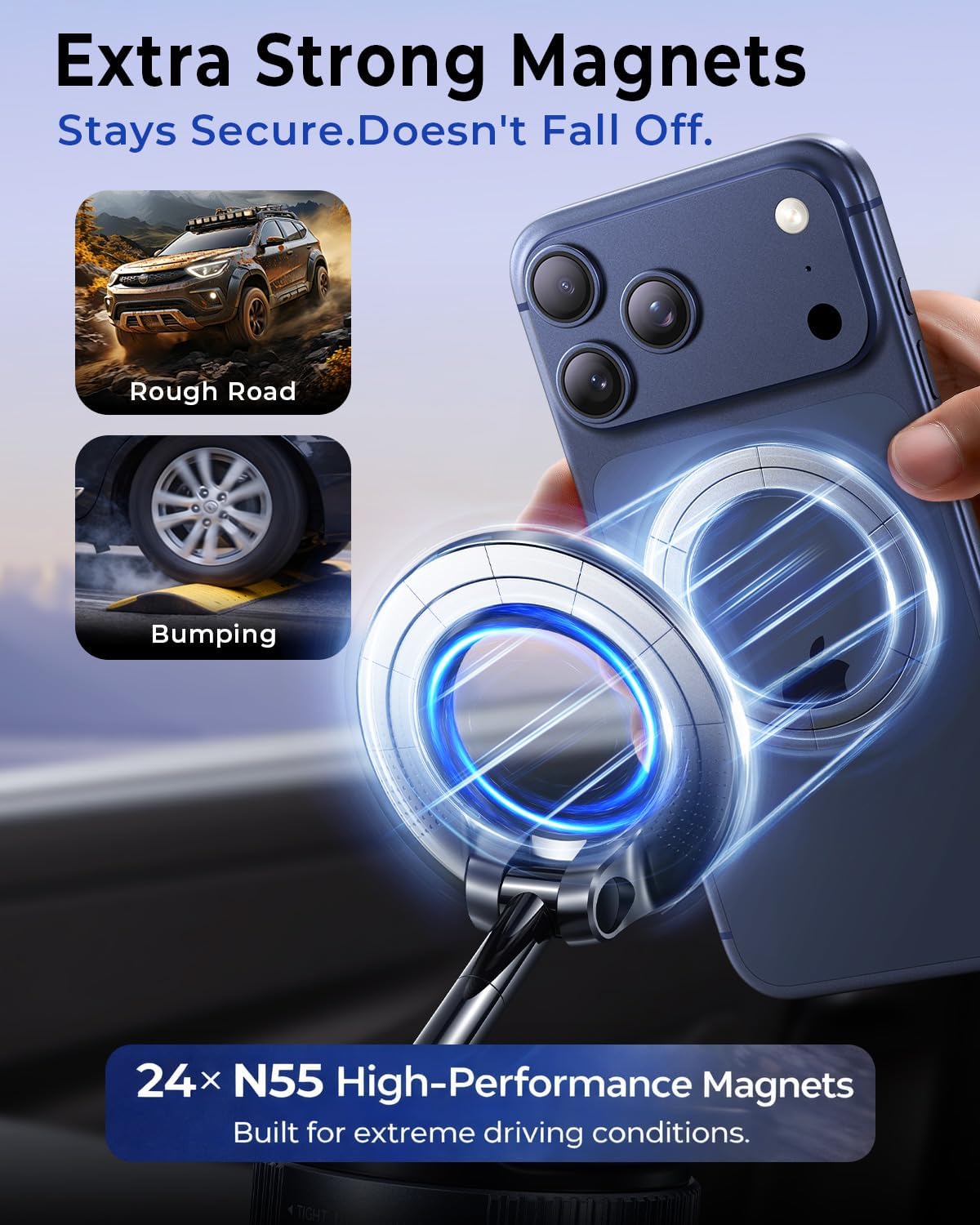 [SUPER STRONG MAGNETIC FORCE FOR ULTIMATE STABILITY]:Equipped with 24 powerful N55 magnets, this phone holder offers magnetic strength that is 240% stronger than conventional magnets and delivers up to 2800gf magnetic force. It can securely hold devices such as the iPhone 16 Pro Max. After 6,000 vibration tests and extreme road simulations, you can rely on your phone to stay firm even in difficult conditions. The precise magnetic design ensures strong grip without disturbing the signal of the phone, allowing you to enjoy uninterrupted navigation and clear calls.