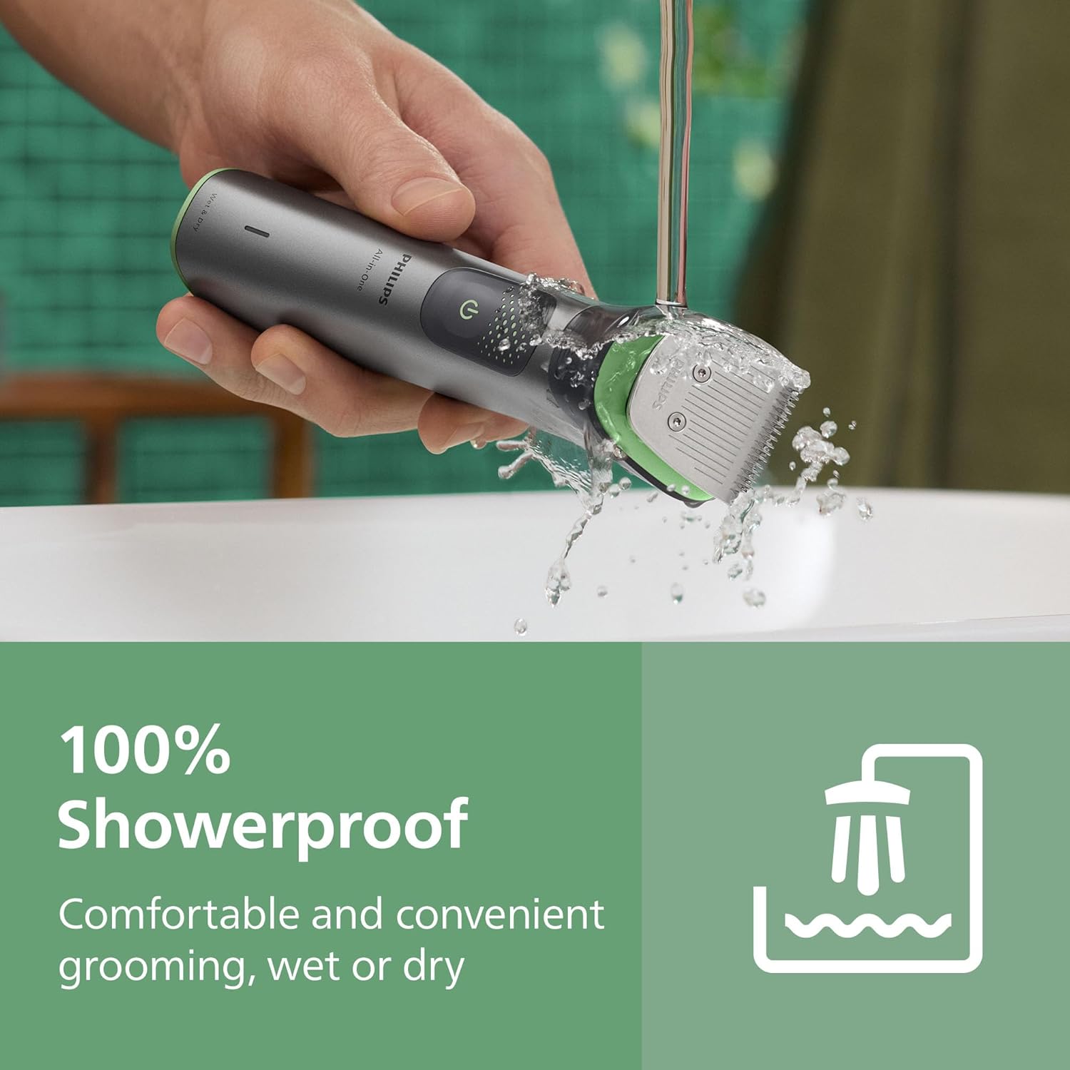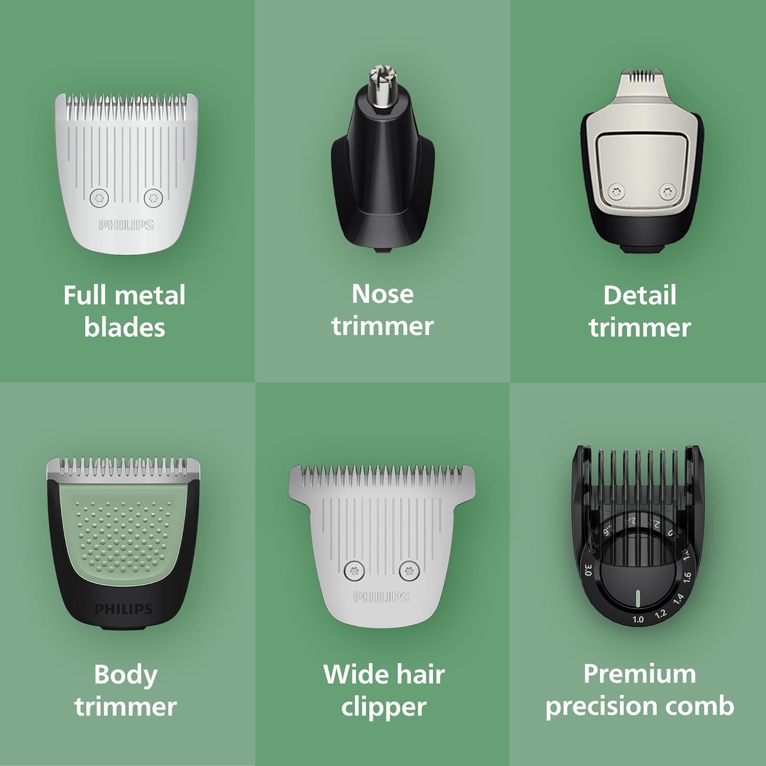 Try out a new look any day of the week with the durable Philips Multigroom 7000 all-in-one hair trimmer for men. With 19 attachments, self-sharpening steel blades for long-lasting precision, and a durable 120-minute lithium-ion battery, this versatile and efficient electric razor for men efficiently tackles all your grooming needs. It’s a hair and beard trimmer men can always rely on! Effortlessly trim and style your beard and hair with precision blades and beard combs that deliver clean, straight lines for your desired look. Use the hair-clipping comb with various length settings to maintain your hairstyle at home. With the click-on body comb ensuring a gentle, effective trim, the device also works perfectly as a body trimmer for men. Plus, you can easily remove unwanted nose and ear hair without nicks or cuts with the nose hair trimmer attachment. Achieve a precise and even trim with self-sharpening steel blades that deliver added strength for maximum precision, staying as sharp as day one with no blade oil required. Select from 0.5 to 20 mm length settings to craft your desired look to the exact length you want. Experience gentle and comfortable grooming with the unique blade technology featuring rounded tips for a softer touch on your skin. The All-in-One trimmer’s intimate comb provides gentle protection for sensitive areas during trimming, ensuring extra care. The ergonomic grip allows for easy handling and maneuverability, providing the comfort and control needed to achieve your ideal look. Built to last, the durable lithium-ion battery offers up to 120 minutes of runtime for uninterrupted trimming. The battery indicator keeps you fully informed of your battery status, whether it’s low, empty, fully charged, or still charging, ensuring you’re always ready for your next grooming session. With USB-A charging, it’s easy to power up anywhere (adaptor is not included). The trimmer is 100% showerproof, so you can use it both wet and dry for a comfortable, convenient experience, every time. Plus, it’s easy to clean too.