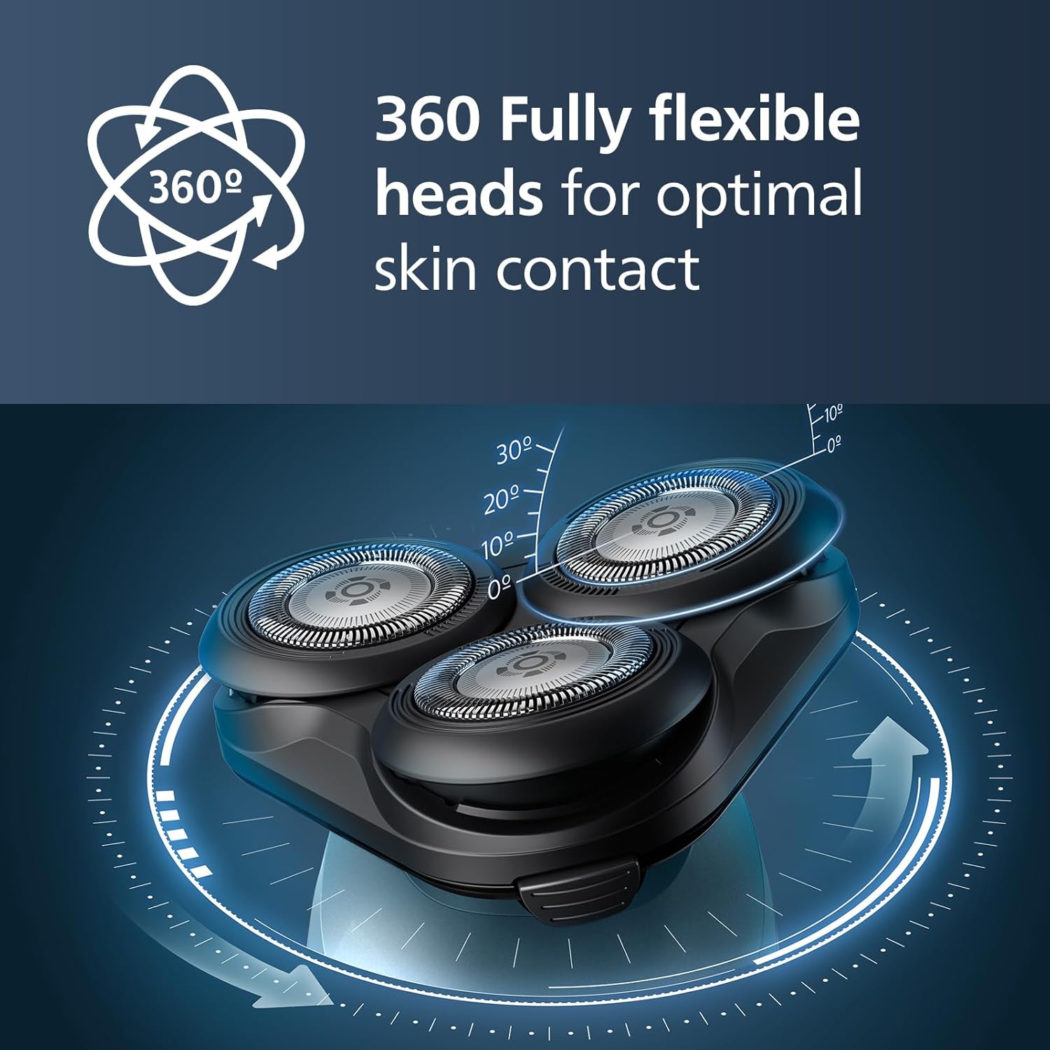 Features fully flexible heads that turn 360 to follow your facial contours for improved skin comfort; a click-on SmartClick precision beard trimmer for maintaining your mustache and sideburns