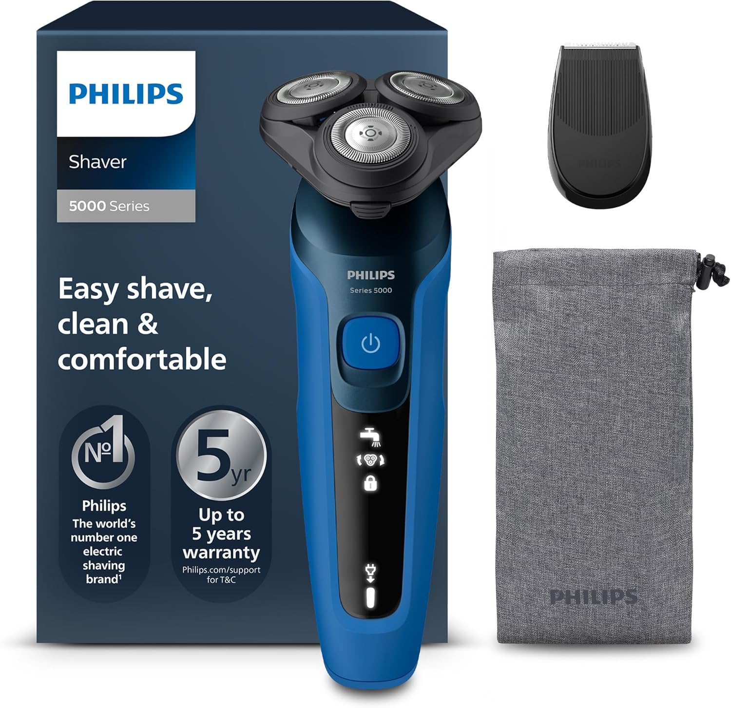 The Philips Series 5000 beard shaver glides smoothly over your skin and brings comfort to your morning routine. ComfortTech self-sharpening blades, 360 flexing heads for an optimal skin contact, and a waterproof ability to perform in both wet and dry conditions give you a thorough and comfortable shaving experience. It comes with an open flip head that can be rinsed with water for cleaning, a click-on SmartClick precision beard trimmer for shaping your mustache and sideburns, and an intuitive display that includes 3 level battery status, cleaning advice, and travel lock indicator, an integrated trimmer, and a travel case.