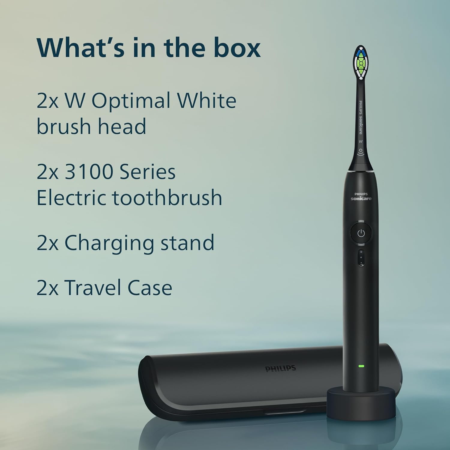 The set includes: 2x Philips Sonicare 3000 Series sonic electric toothbrushes, 2x W Optimal White brush heads, 2x travel cases, 2x chargers