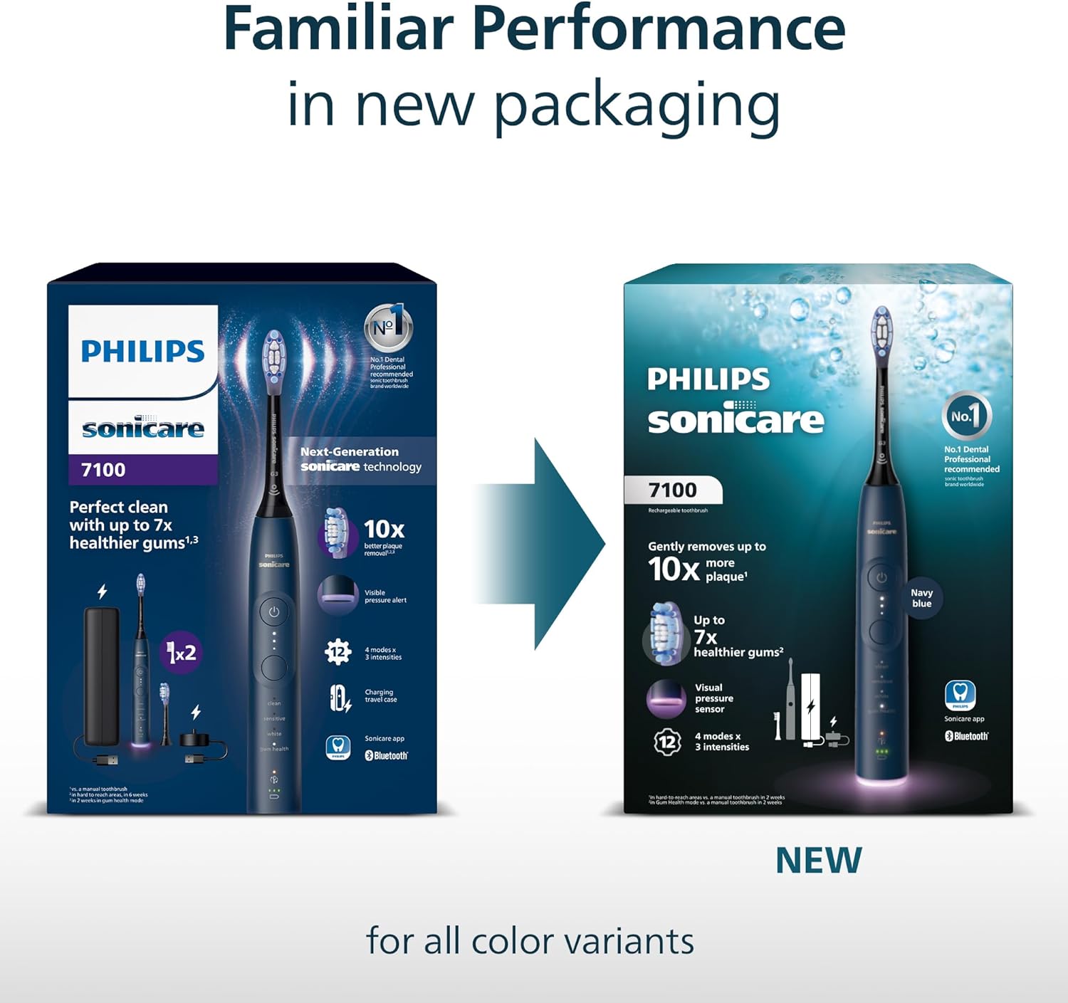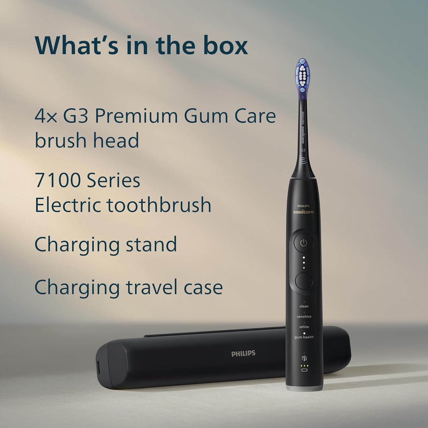 The set includes: 1 x 7100 sonic electric toothbrush, 4 x G3 Premium Gum Care brush heads, 1 x Charging travel case, 1 x Charger, 1 x USB-A charging cable; power adapter not included. Packaging may vary