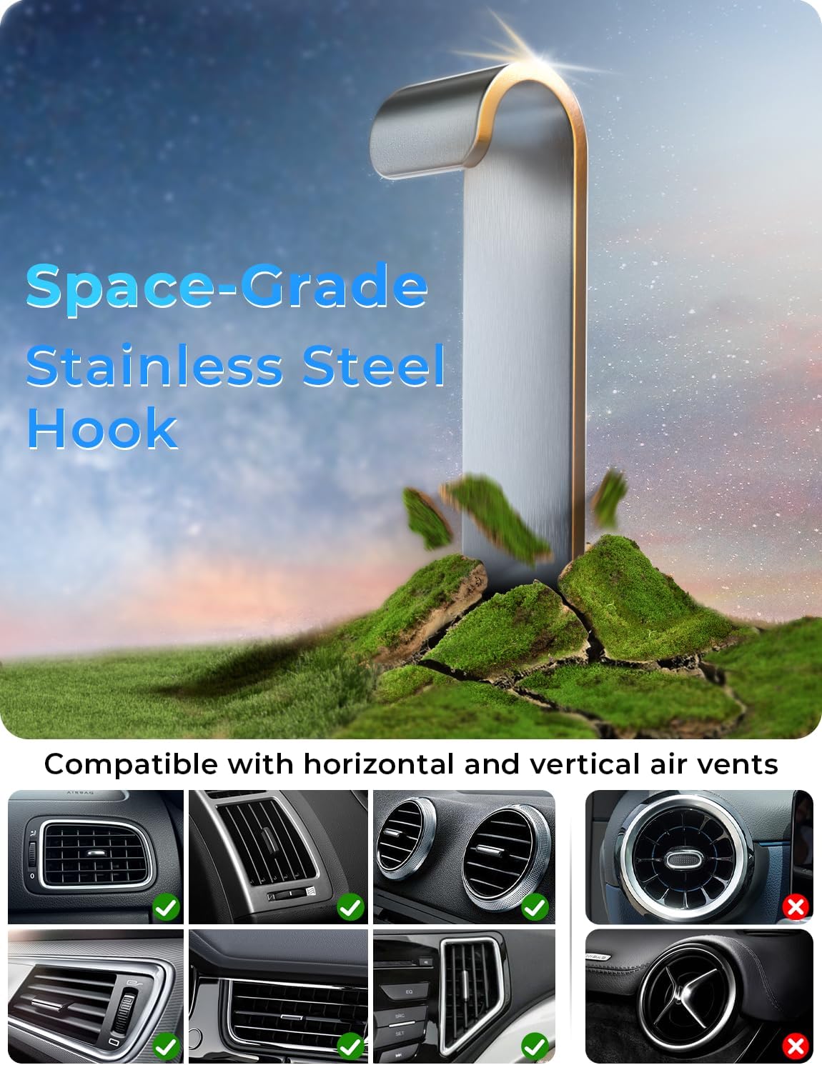 [ Protect Car Air Vent This car phone holder is equipped with a stainless steel hook with a maximum extension of 35mm, and the contact surface between the base and the air vent is equipped with rubber, which can protect your air vent from damage.