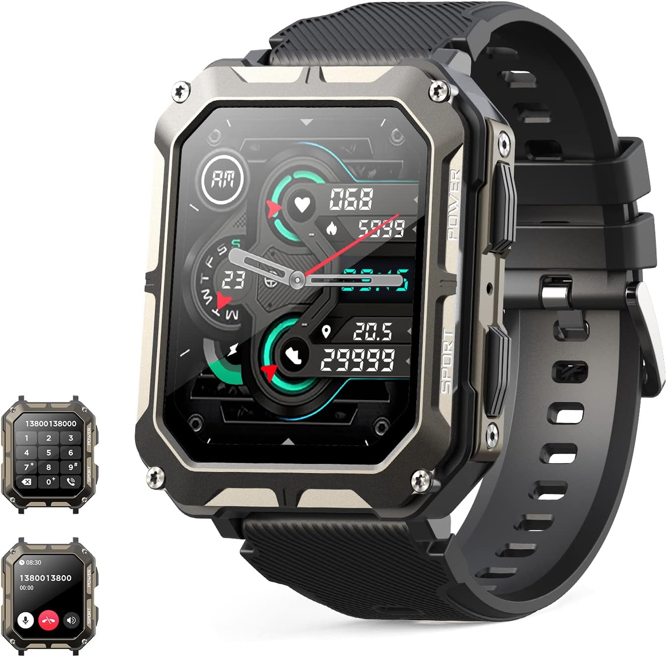Specification: Smart watch military for men with call dials that can make calls and answer calls compatible for iOS Android, Fitness Activity tracker with IP68 Waterproof Ai voice, with 123 Sports Modes