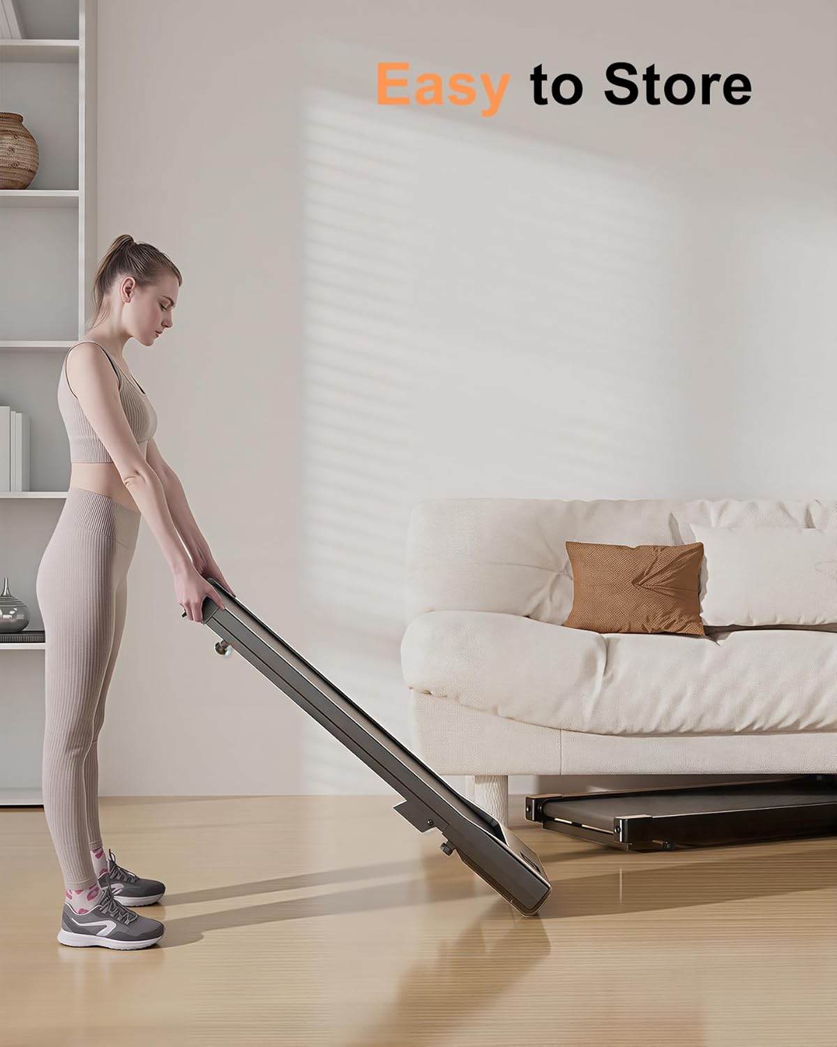 You can move this thing around! It’s very light weight and I like it very much. If it’s heavy and it’s killing me, I’ll find an excuse not to use it. It’s very light, so it’s easy to take it out, use it, and put it back where it was. I measured it. It fits right under the table. When not in use, I put my feet on the floor because I’m short and my feet don’t touch the floor comfortably. The sound is not too loud when used, the display is easy to read, the remote control is easy to use, and the function is normal. Mine is fine. It holds a lot of weight compared to other pads, so my husband can use it if he wants to. I have a very nice treadmill in my basement, and this treadmill, in contrast, is very good quality. I’ve recommended it to my colleagues because we all work remotely.