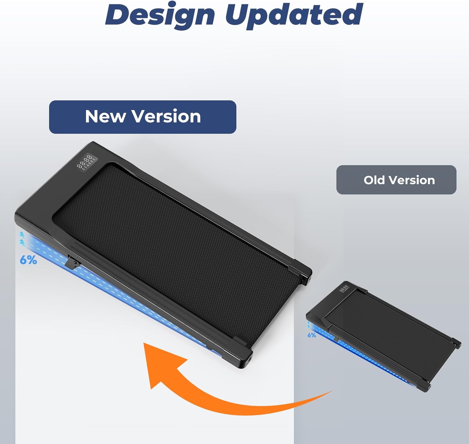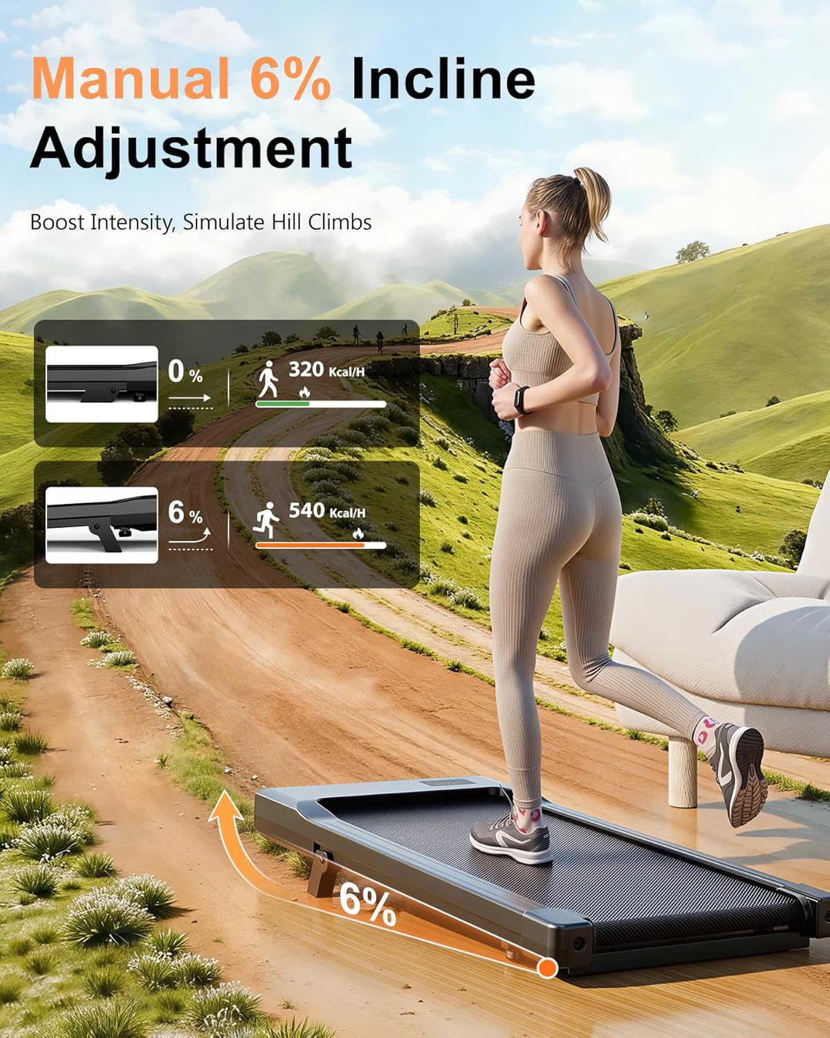 [6% Incline Walking Pad] Featuring a 6% adjustable incline, this walking pad simulates a gentle hill climb for more effective, low-impact workouts. The incline mode is excellent for toning legs and glutes, and can boost your workout intensity by up to 60%—helping you maximize results from the comfort of home.