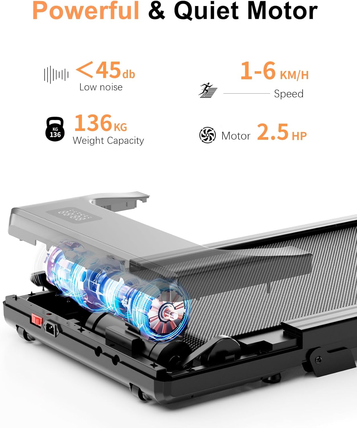 [QUIET AND ABSORBENT DESIGN] Our under desk treadmill for home features a 2.5HP motor and a running belt composed of 5 non-slip layers with shock absorbers to reduce noise and impact on knees, muscles and ankles.136 kg weight capacity and a speed range of 1-6KM/H, the desk treadmill meets the needs of a wide range of people who exercise indoors.