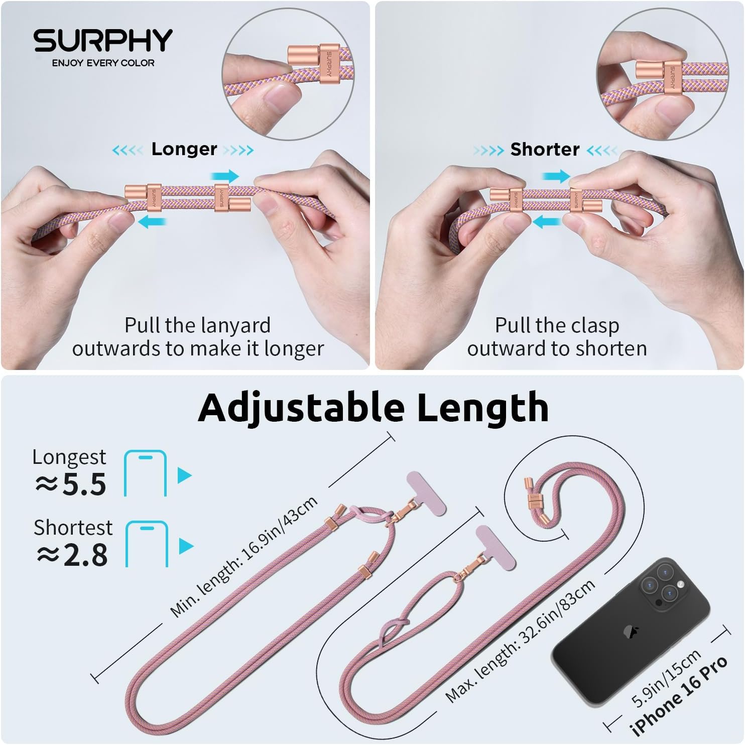 Specification: SURPHY Phone Lanyard with Patch, Adjustable Crossbody Phone Strap, Neck Phone Holder Compatible with Most Phones, Key Lanyard and more (Pink & Purple)