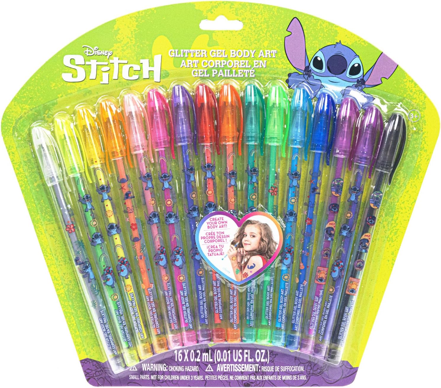 KIT INCLUDES: 16 glitter body gel pens. Colors include various shades of green, blue, red, black, pink, gold, silver, and more. All the colors your little one needs to create a work of art!