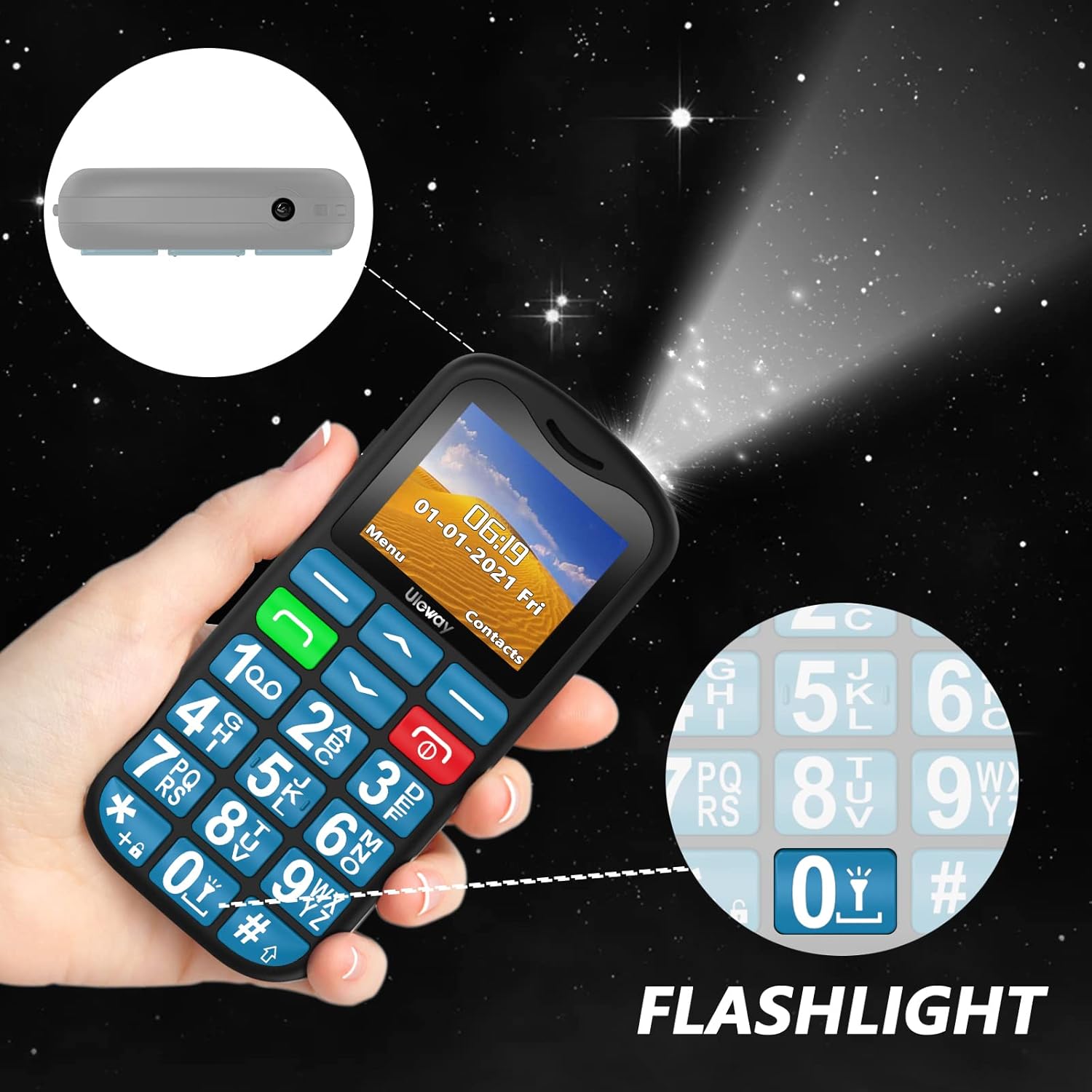 You can press the “0” key on the easy to use mobile phone to quickly turn on/ off the highlight flashlight, protect you from unnecessary harm when walking at night. Convenient, practical and safe for elderly.