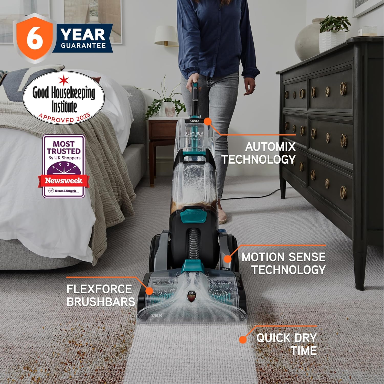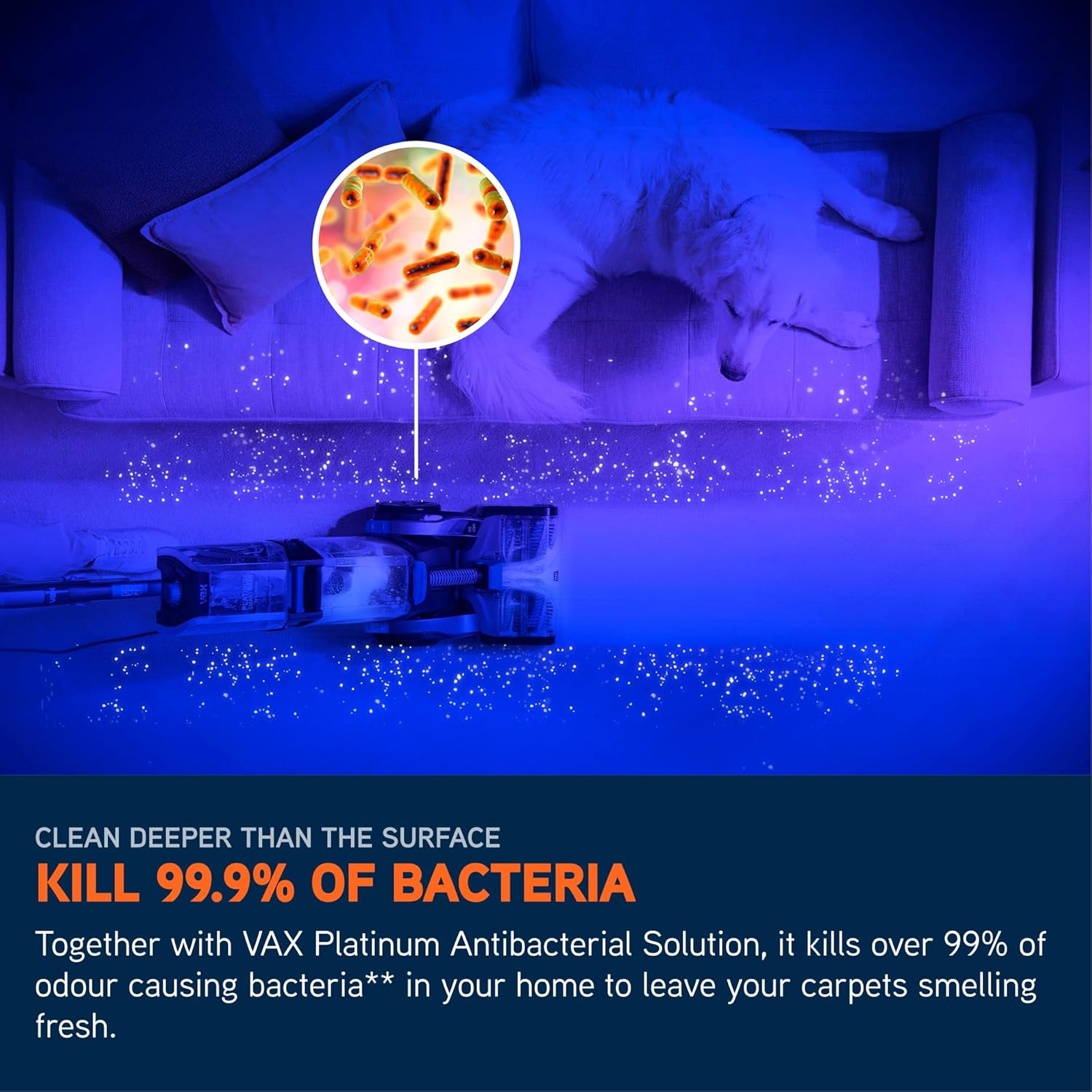 POWERFUL DEEP CLEANING AND REMOVES OVER 99 PERCENT OF BACTERIA – Advanced FlexForce Brushbars with flexible bristles penetrate deep into carpet fibres helping remove stains, dirt and grime, delivering visible results throughout your home, while the VAX Platinum Antibacterial Solution removes over 99 percent of odour causing bacteria, cleaning your carpets 7 times better than a high performance vacuum cleaner and leaving your carpets smelling fresh