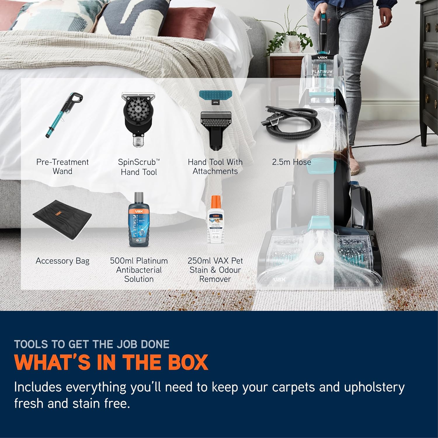 WHAT’S IN THE BOX – VAX Platinum SmartWash Pet-Design Carpet Cleaner, Pre-Treatment Wand, SpinScrub Hand Tool, 2-in-1 Antimicrobial Wash Tool with carpet and upholstery attachment and hard floor cleaning attachment, 2.5m Hose, 500ml VAX Platinum Antibacterial Solution, 250ml Pet Stain & Odour Remover, Accessory Bag