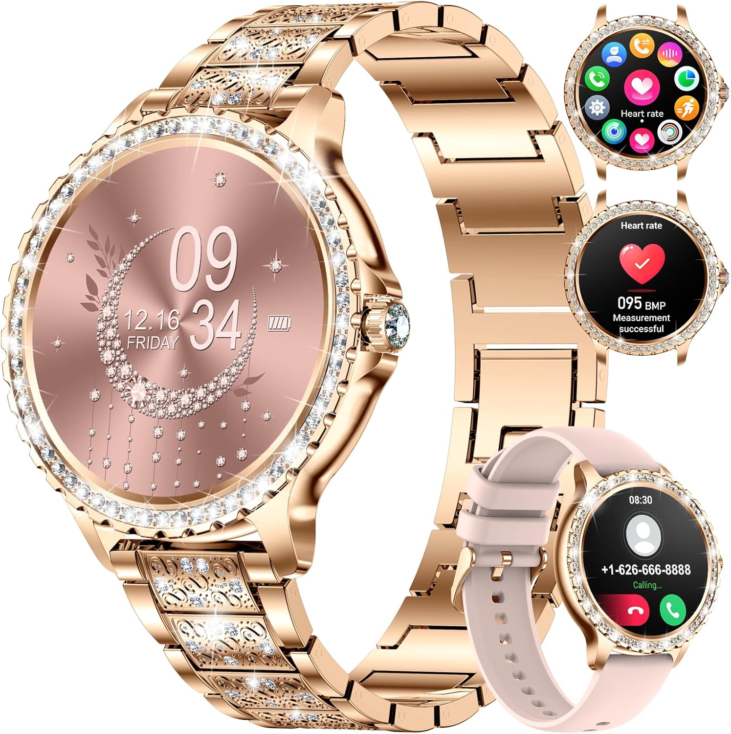 Women’s Smart Watch Bluetooth Phone Calls for Android iOS 100+ Sport Fitness Tracker 1.32″ HD Female Smartwatch Heart Rate Sleep Monitor Diamond Ladies Smartwatch Rose Gold Steel,2 Watch Straps